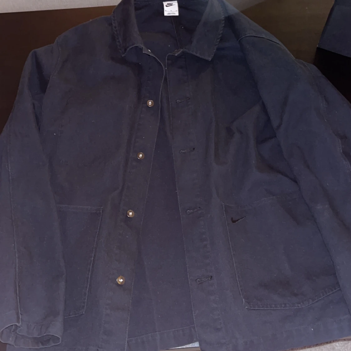 Säljer en svart jacka från Nike med knappar framtill och två fickor. Jackan har en klassisk krage och är perfekt för en avslappnad stil. Passar bra till både vardag och träning.
