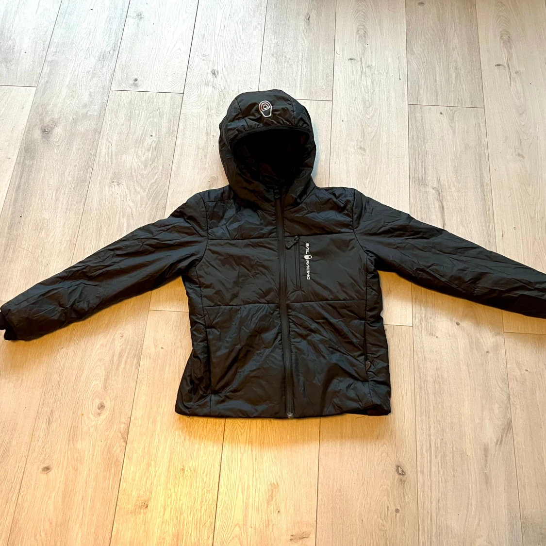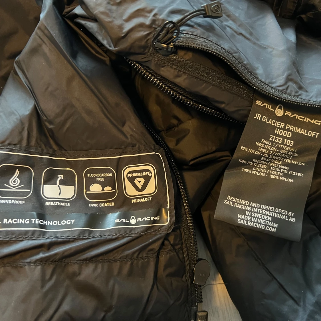 Snygg svart jacka från Sail Racing med huva och dragkedja. Tillverkad med Primaloft-teknologi för extra värme och komfort. Jackan är vindtät och andas bra, perfekt för kyligare dagar. Storlek 150.