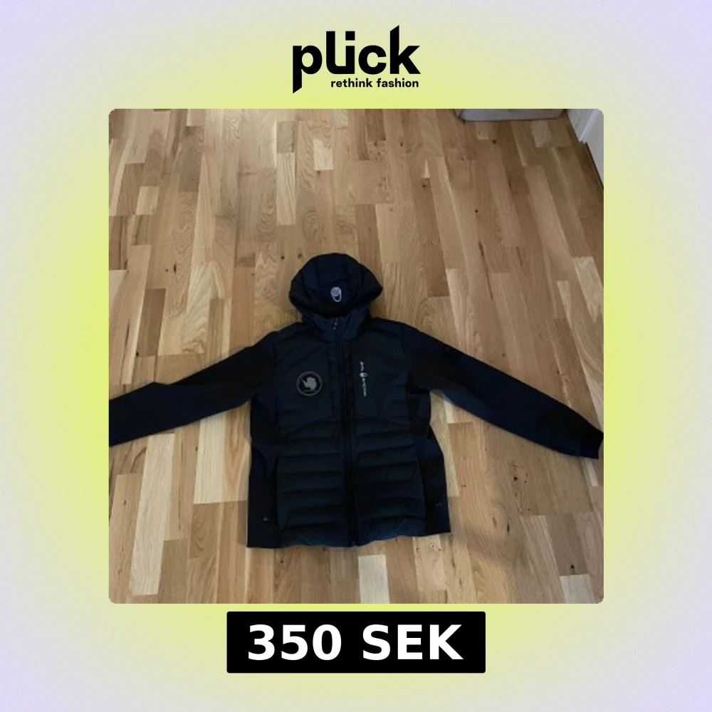 Säljer en svart jacka från Sail Racing med huva och dragkedja. Jackan har en stilren design med vadderade paneler och en logotyp på bröstet. Perfekt för kyligare dagar.
