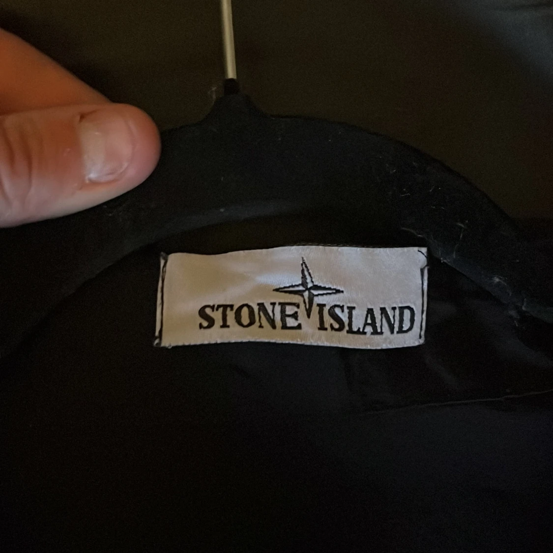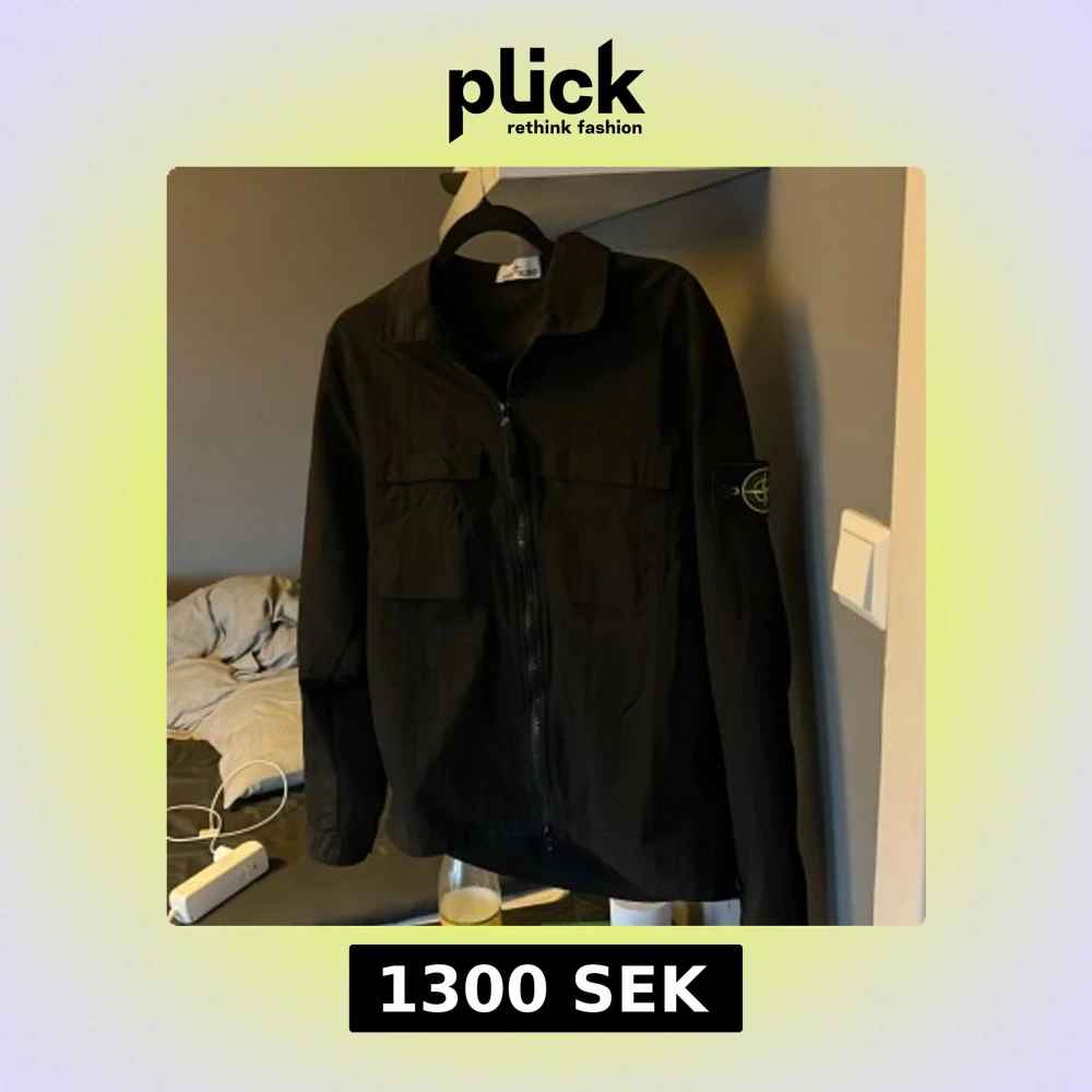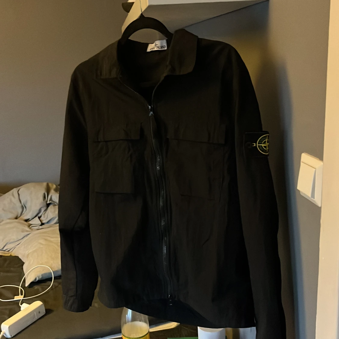 Säljer en stilren svart jacka från Stone Island. Jackan har en dragkedja framtill och två bröstfickor. Den är långärmad och har en klassisk krage. Perfekt för en cool och avslappnad stil.