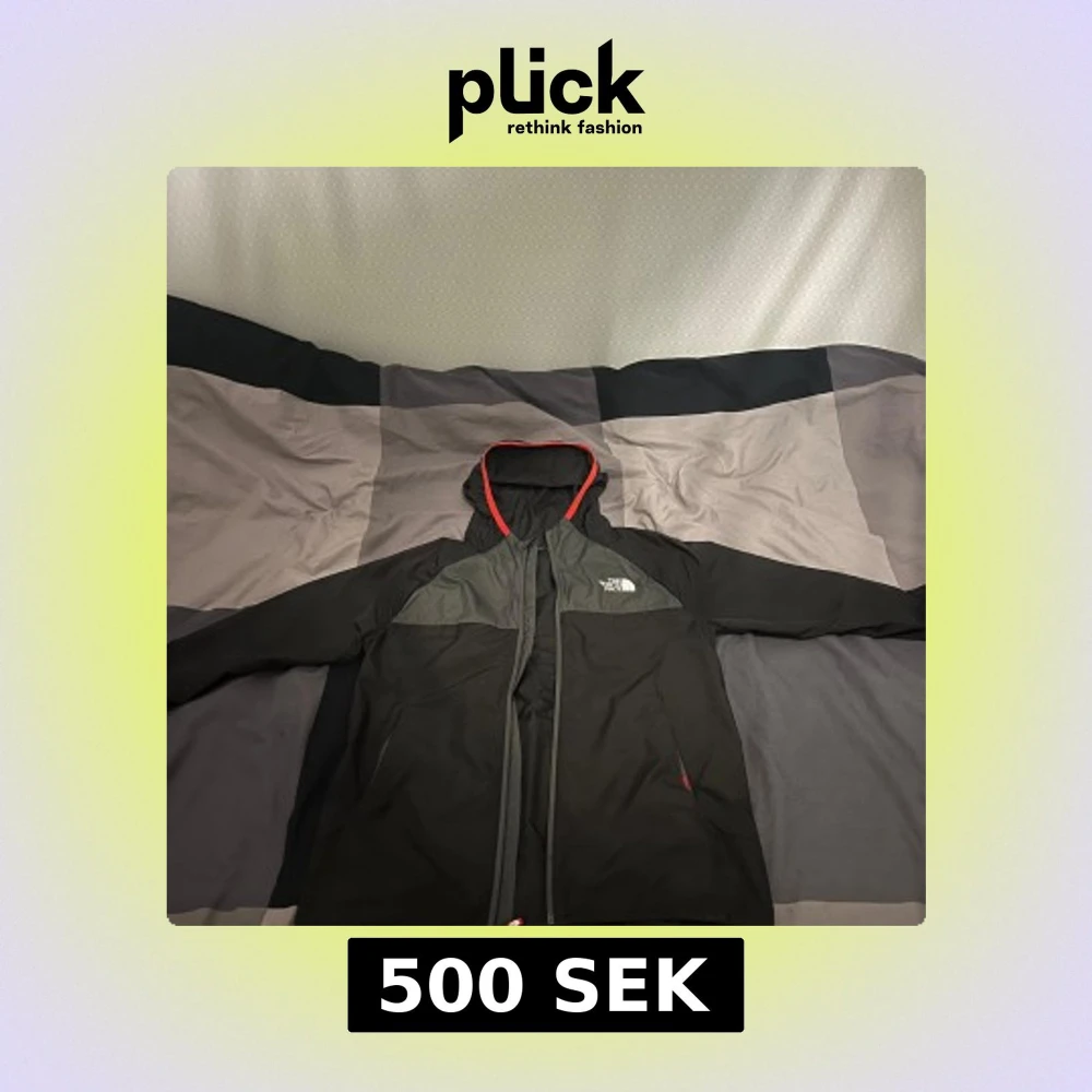 Säljer en svart jacka från The North Face med luva och dragkedja. Jackan har röda detaljer och logotypen tryckt på bröstet och ryggen. Perfekt för varmare dagar.