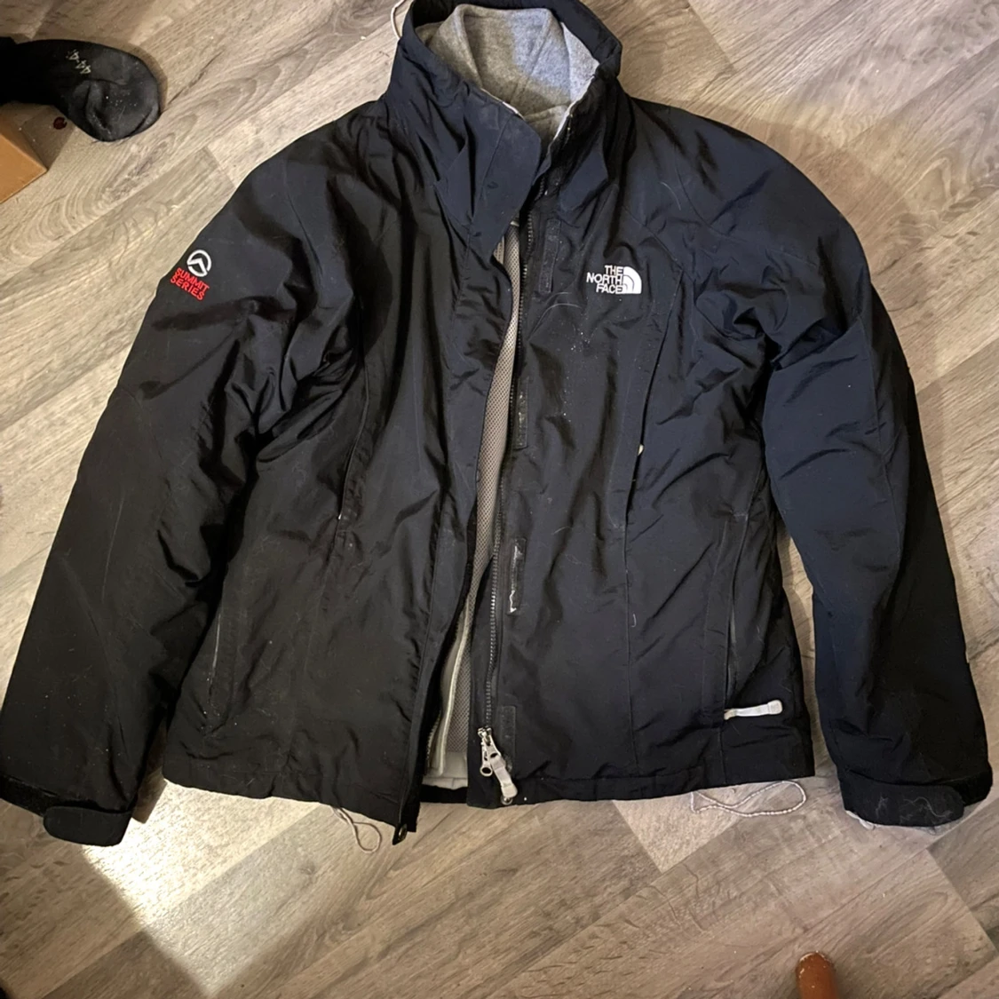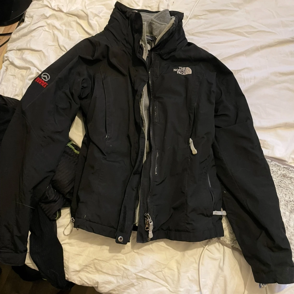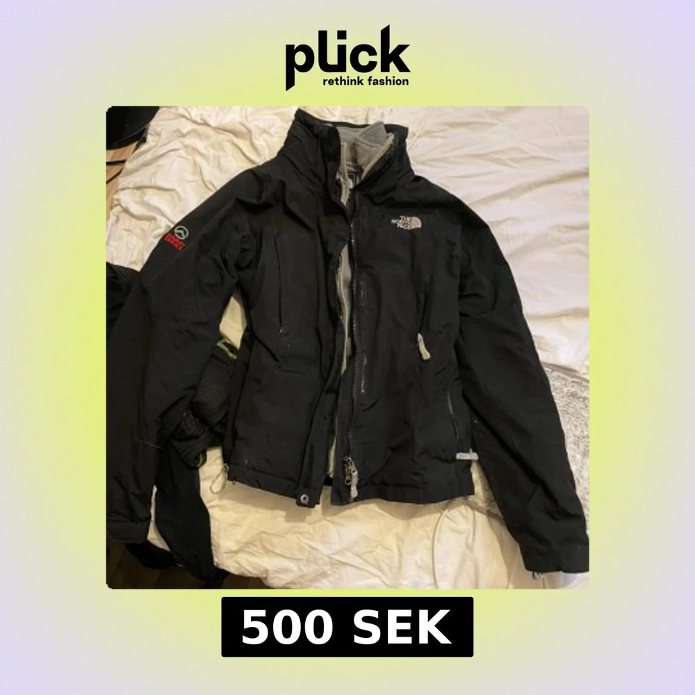 Säljer en svart jacka från The North Face med dragkedja och hög krage. Jackan har långa ärmar och flera praktiska fickor. Perfekt för kyligare väder.