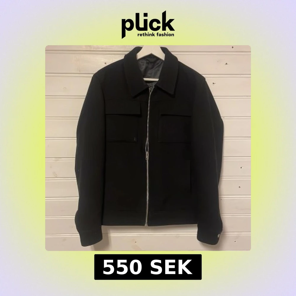 Snygg svart jacka med dragkedja och klassisk krage. Jackan har två bröstfickor och långa ärmar med knappdetaljer vid ärmsluten. Perfekt för en stilren look. Storlek Xs men passar även bra för S