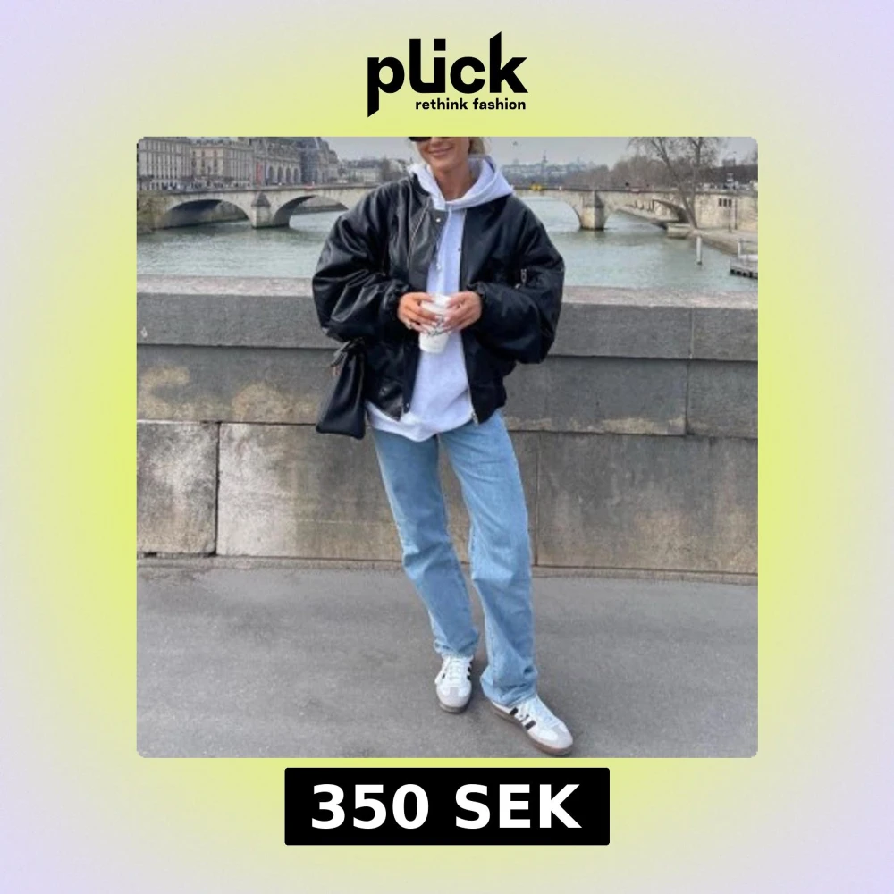 Säljer en svart bomberjacka med dragkedja och knappar. Jackan har en klassisk design med ribbade muddar och två framfickor. Perfekt för en cool och avslappnad stil.