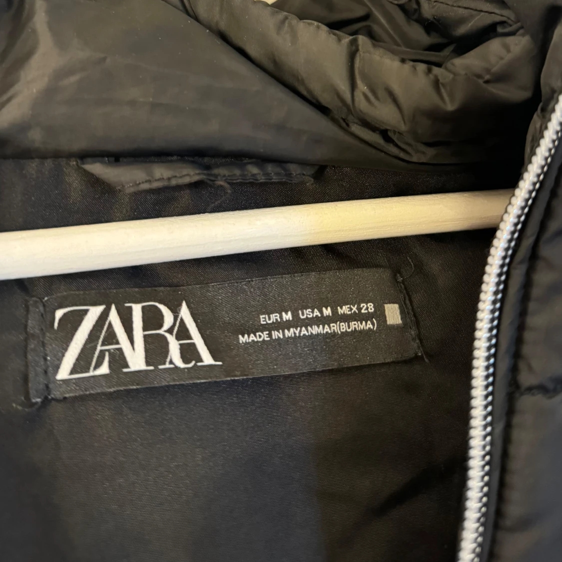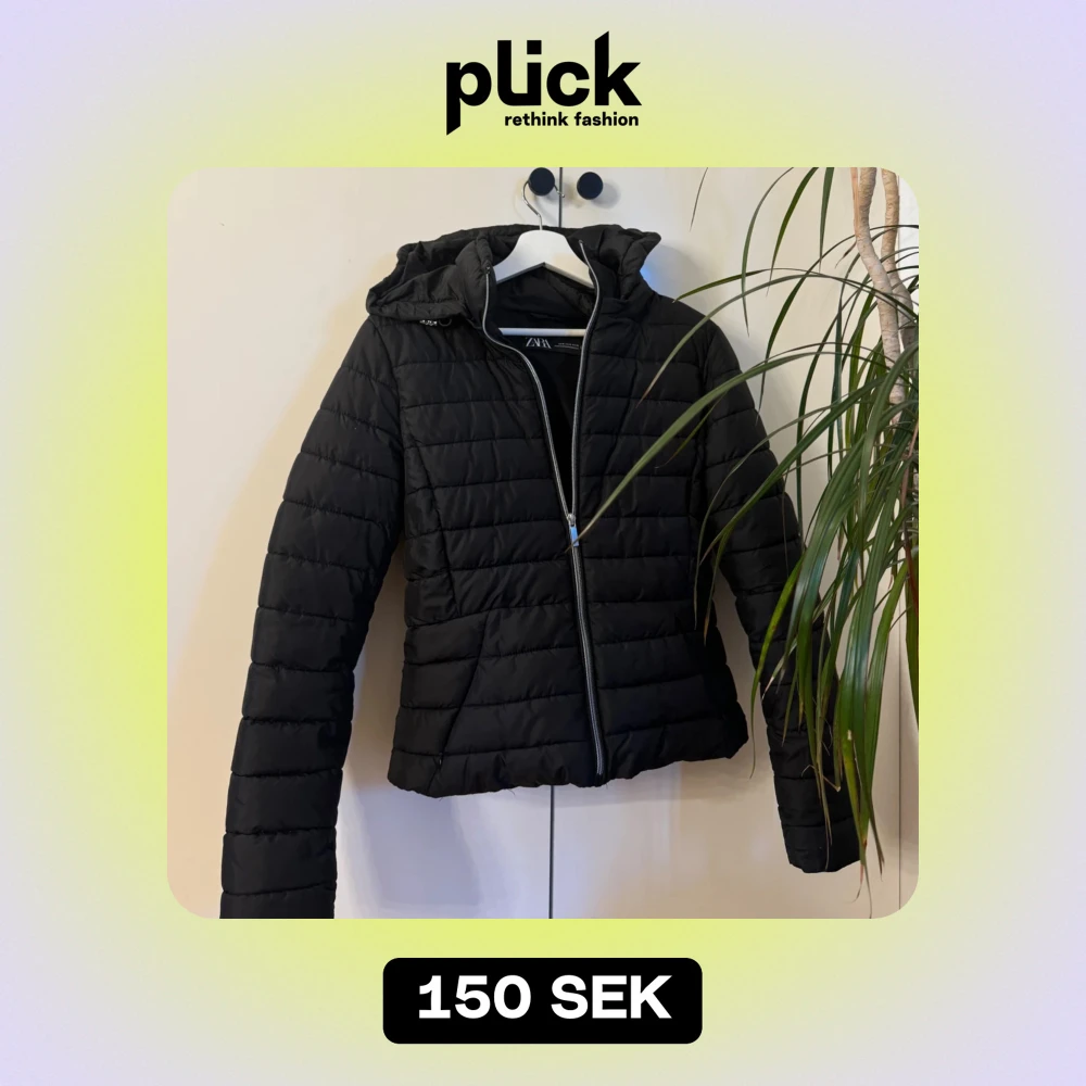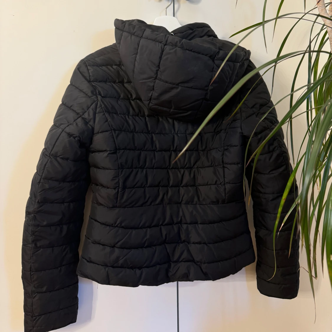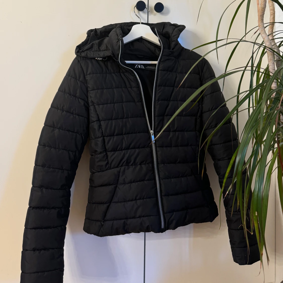 Svart lite tunnare dunjacka från ZARA. Passar perfekt till höst, vår o lite varmare vinterdagar. Snygg o enkel att styla. Storlek M men skulle säga att den motsvarar mer än xs/s i storlek. Mycket bra skick, inga defekter.