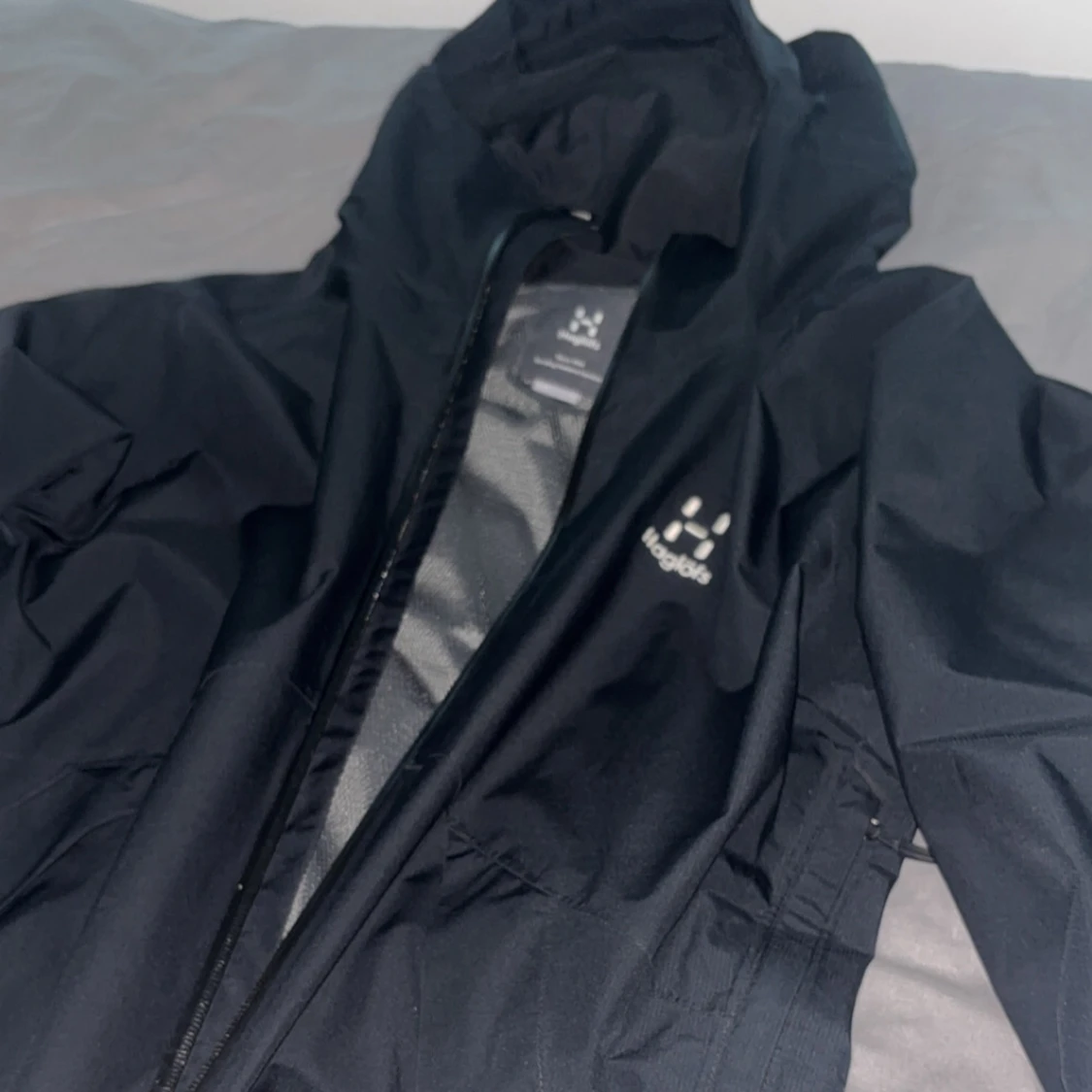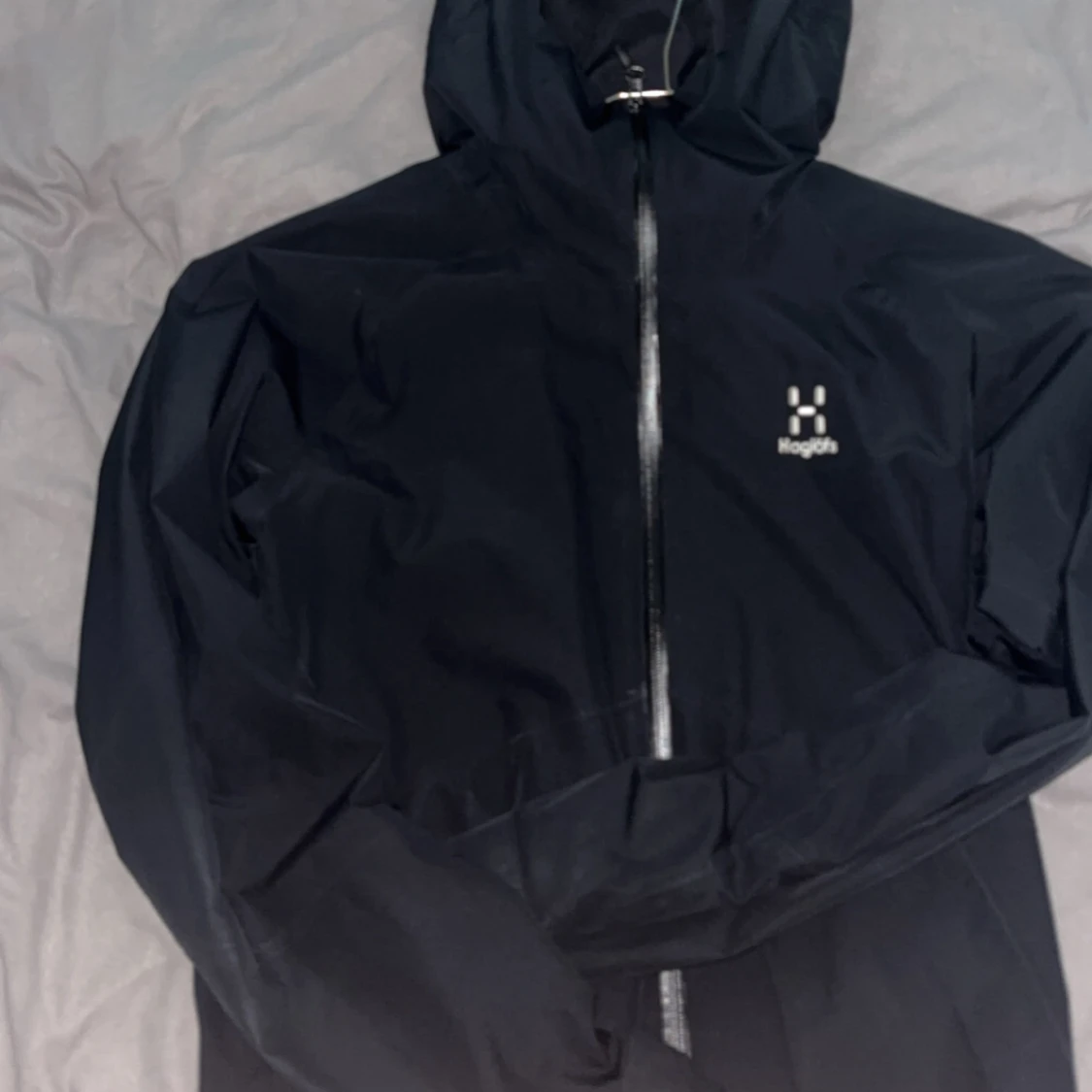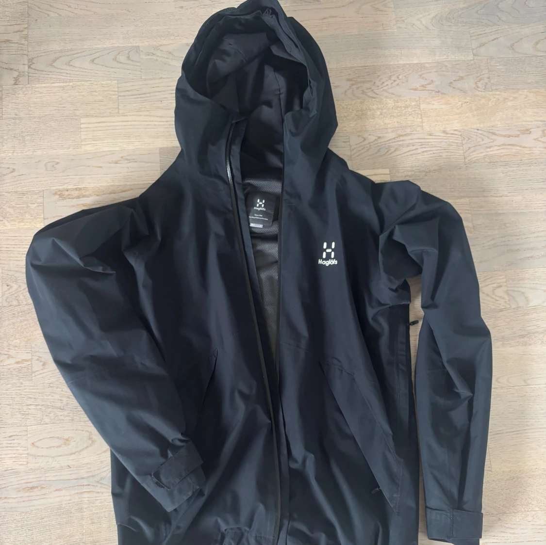 Pris kan diskuteras, skicka dm för video på jackan. Svart regnjacka från Haglöfs med minimalistisk design och broderad logga på bröstet. Jackan har huva, dragkedja framtill och två sidofickor. Perfekt för blöta dagar och enkel att slänga på sig när vädret sviker. Storlek ”M”