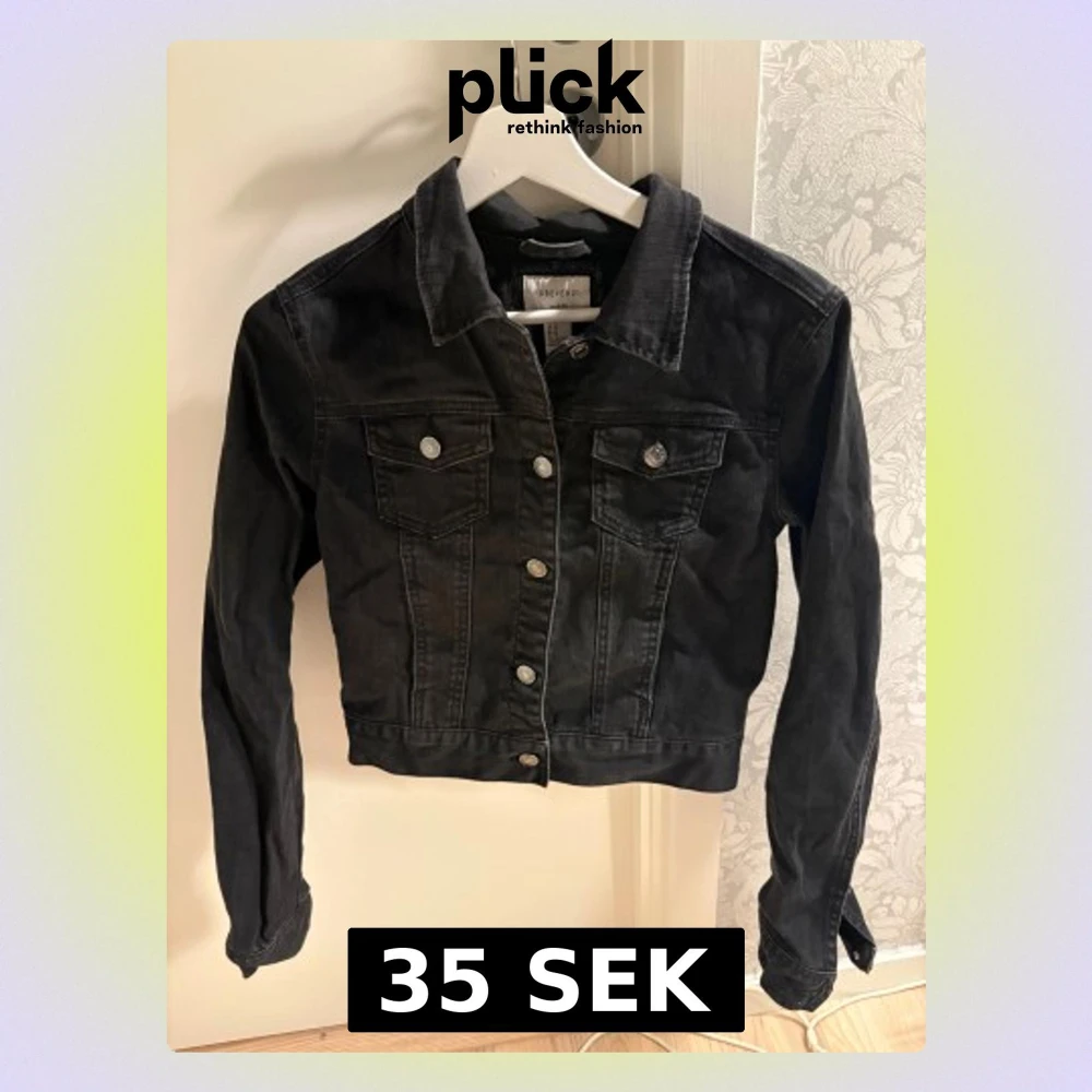 Snygg svart jeansjacka från Forever 21 i storlek M. Men skulle säga att den mer passar någon som har storlek S/XS. Klassisk modell med krage, silverfärgade knappar och två bröstfickor med lock. Jackan har lång ärm och är lätt croppad för en trendig look. Perfekt att slänga över en hoodie eller t-shirt.