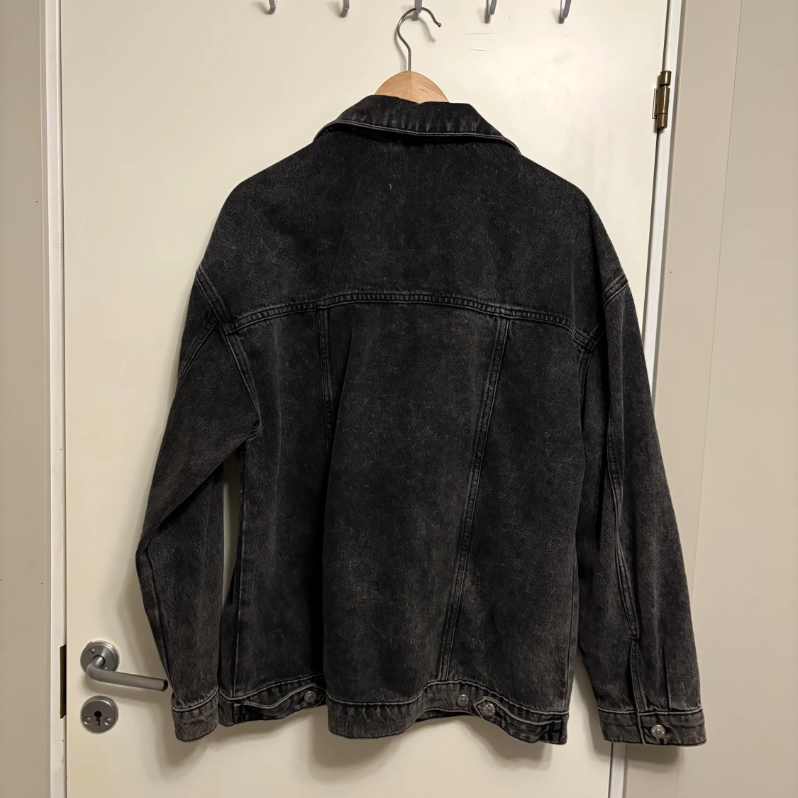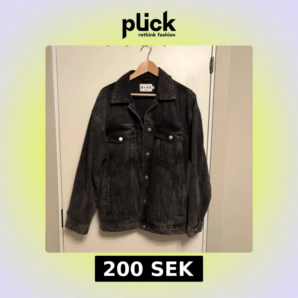 Säljer en svart jeansjacka från NA-KD i klassisk modell med knappar framtill och två bröstfickor med lock. Jackan har långa ärmar och en avslappnad passform, perfekt att slänga över en hoodie eller t-shirt.