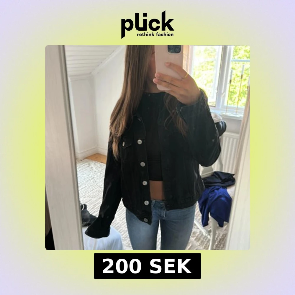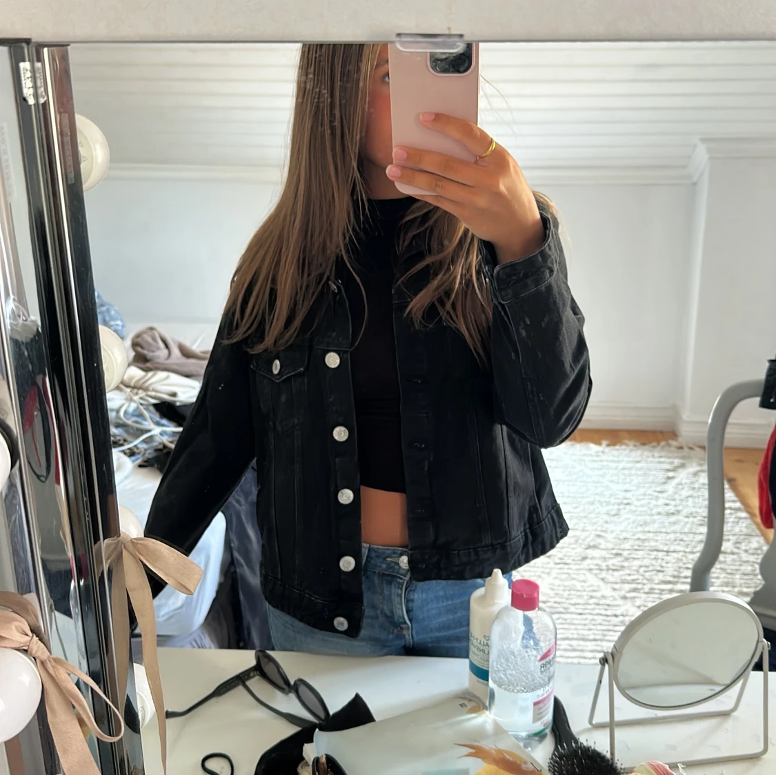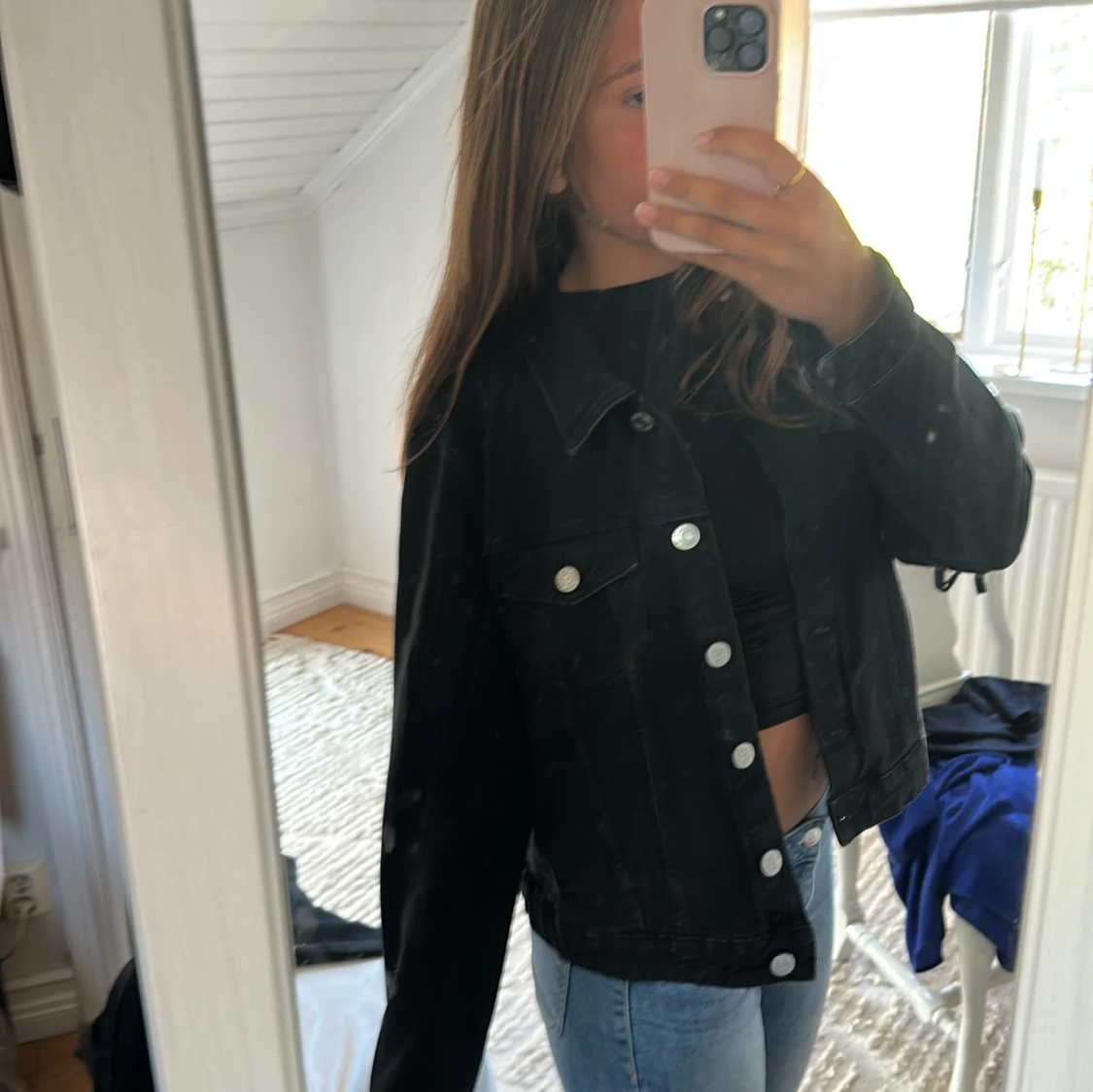 Säljer en svart jeansjacka med klassisk krage och silvriga knappar framtill. Jackan har två bröstfickor med lock och knapp, samt en rak passform som ger en chill vibe. Perfekt att slänga över en hoodie eller crop top.