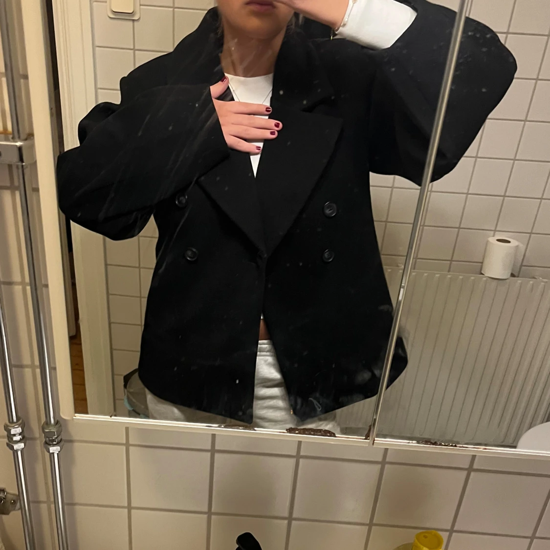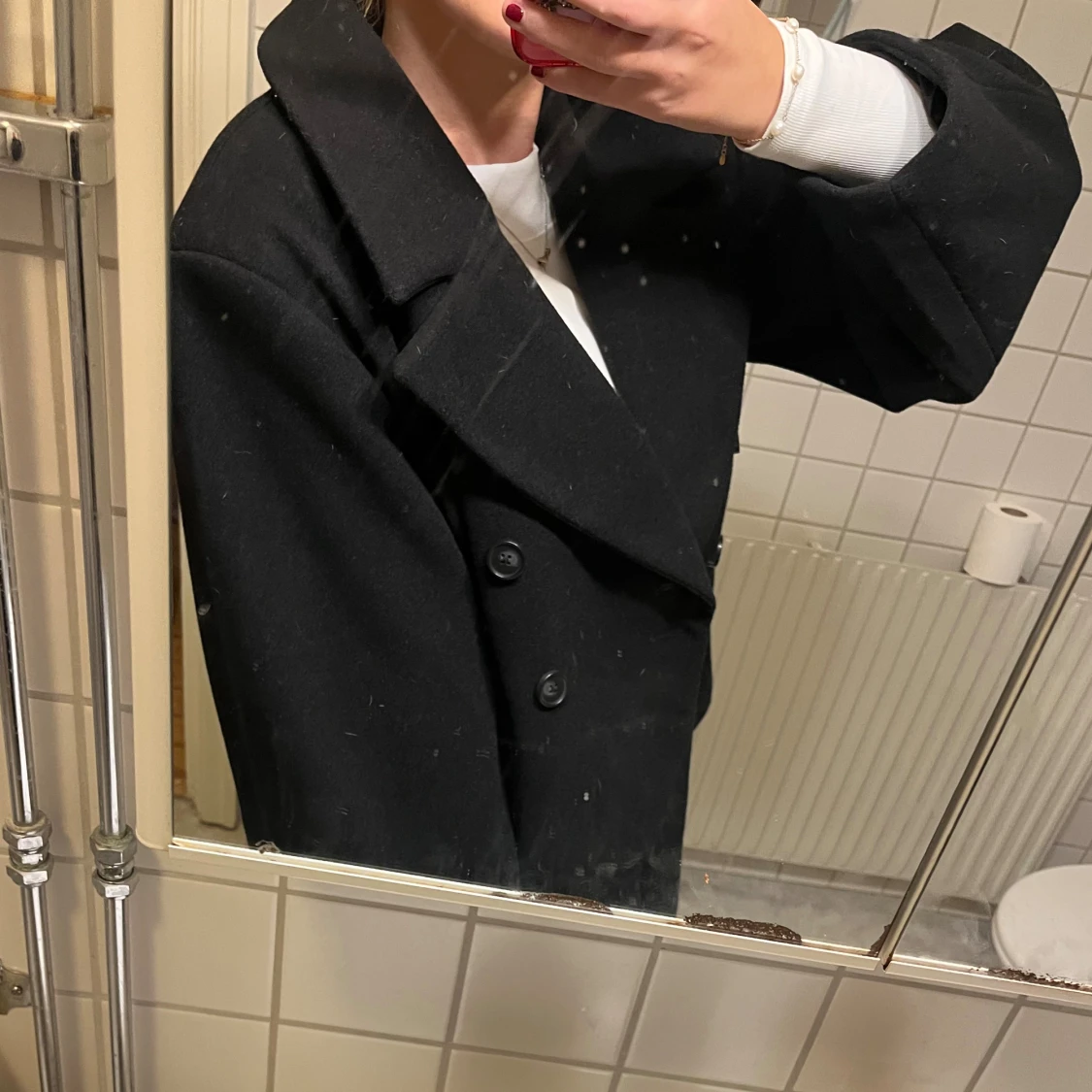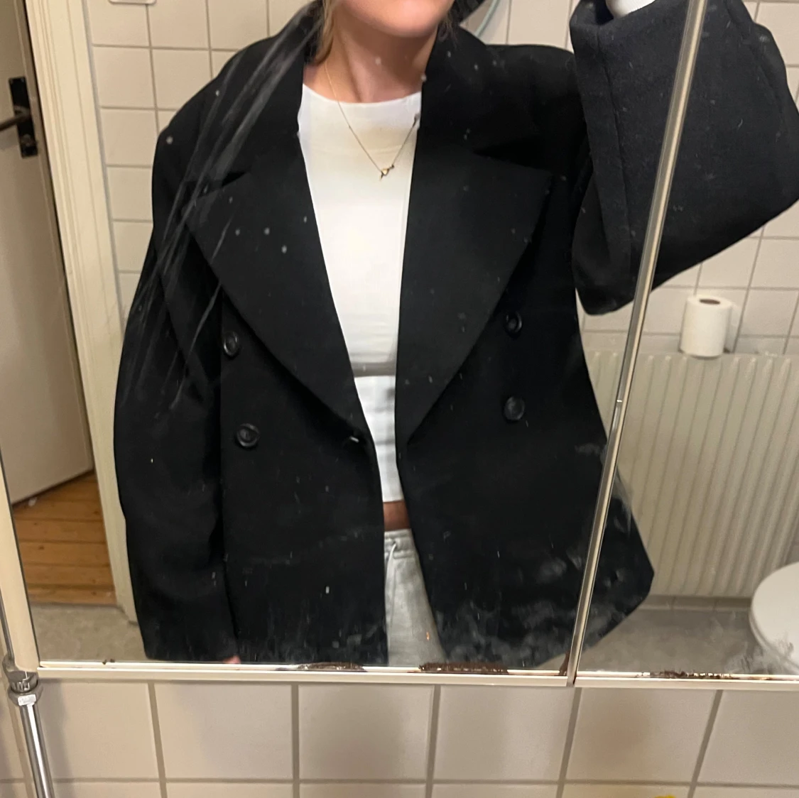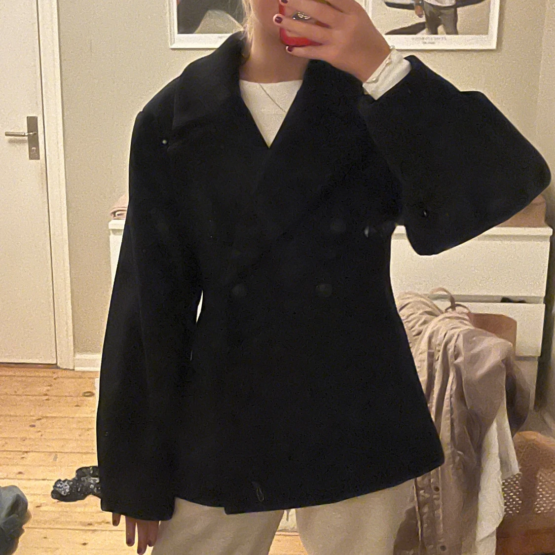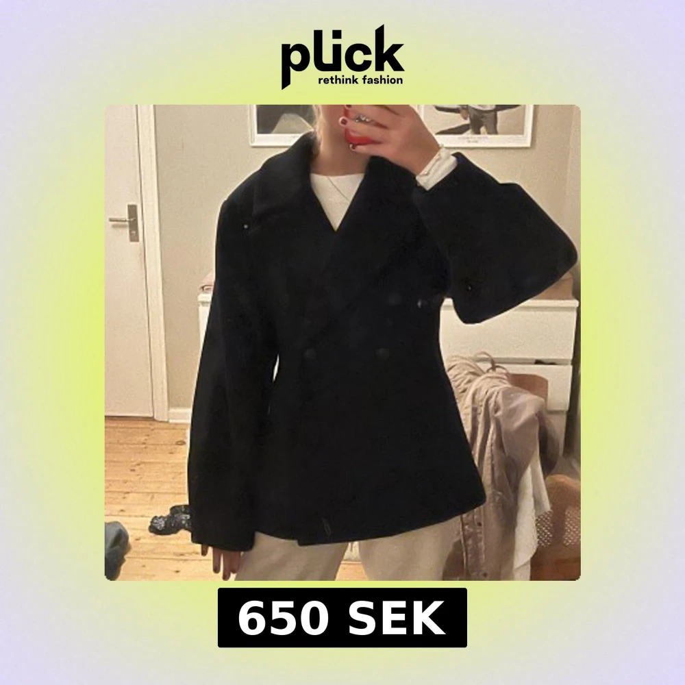 Säljer en svart kappa med dubbelknäppning framtill. Jackan har en loose passform och är långärmad, perfekt för dig som gillar klassisk stil med en modern twist. Materialet är tjockt och känns som ull, vilket gör den nice för kyliga dagar. Aldrig andvänd pga inte passa kostar 900kr nypris