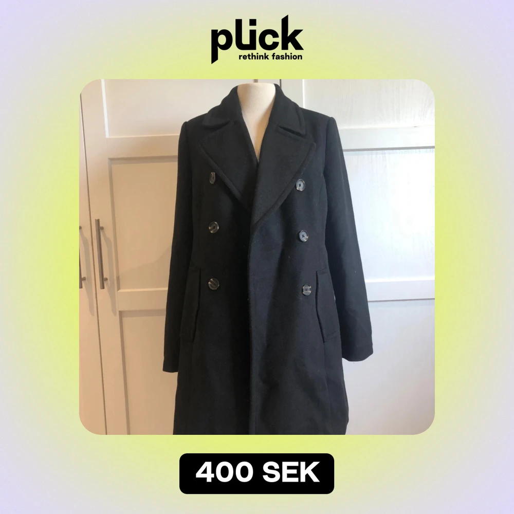 Säljer en stilren svart kappa i mycket bra skick. Den har en klassisk dubbelknäppt design med långa ärmar och en elegant krage. Perfekt för höst och vinter, och funkar lika bra till vardags som till fest. Använd endast ett par gånger.