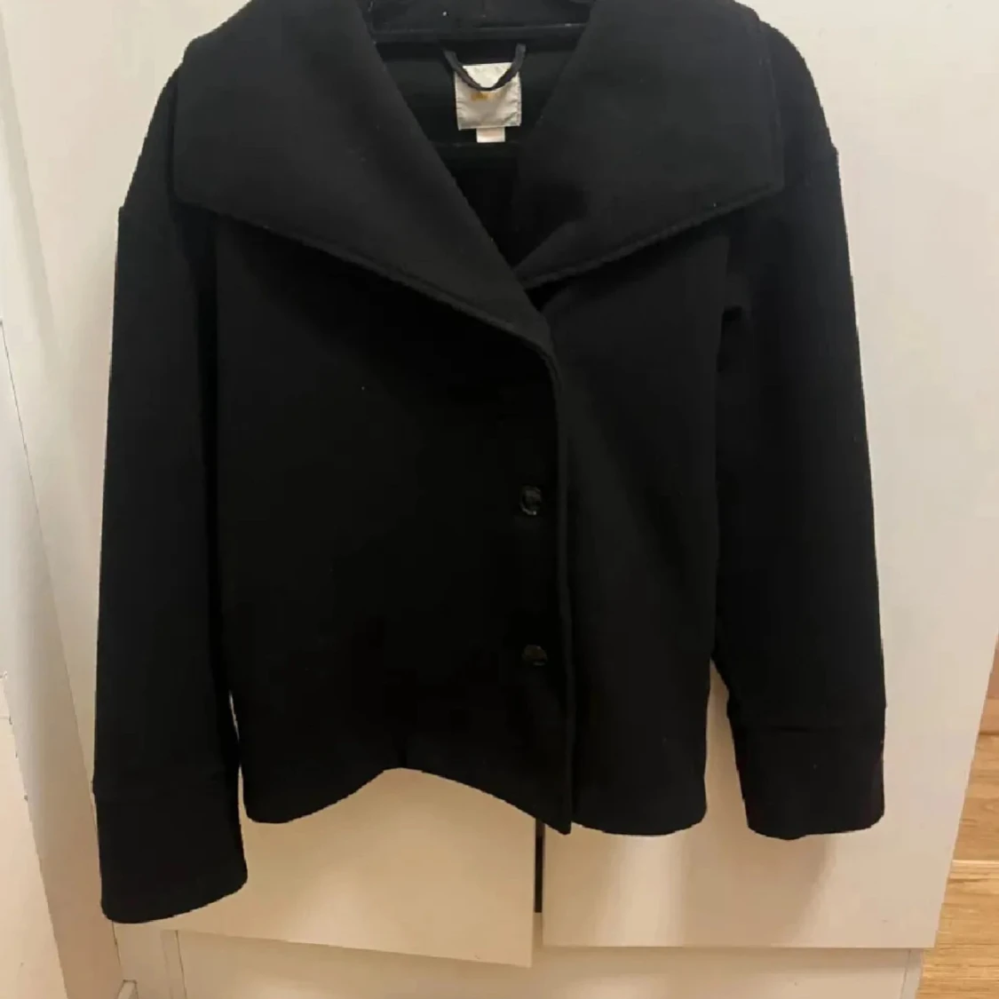 Snygg svart kappa med knappar och bred krage. Perfekt för kyligare dagar och ger en stilren look. PRIS KAN DISKUTERAS!!!