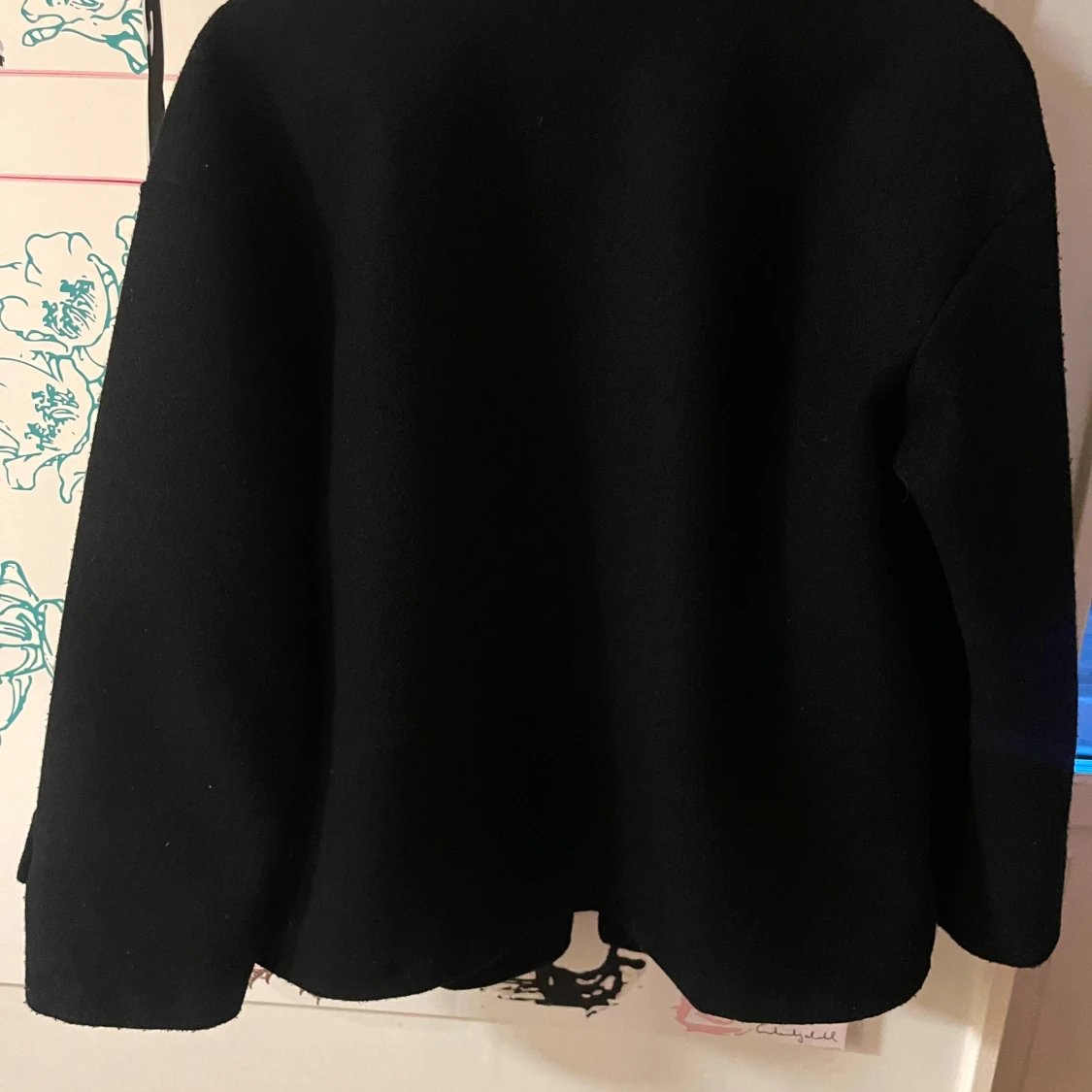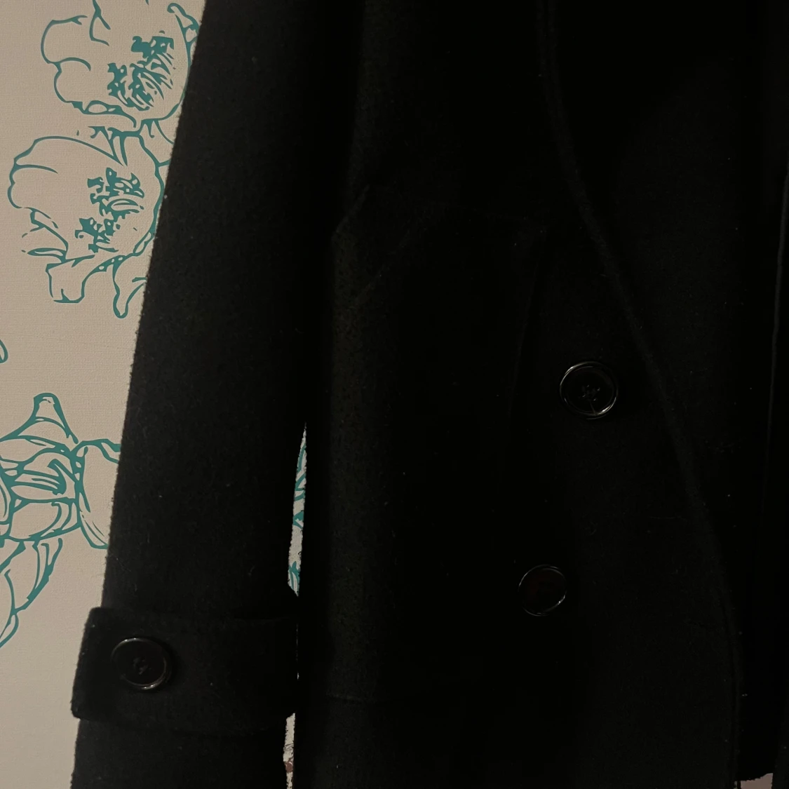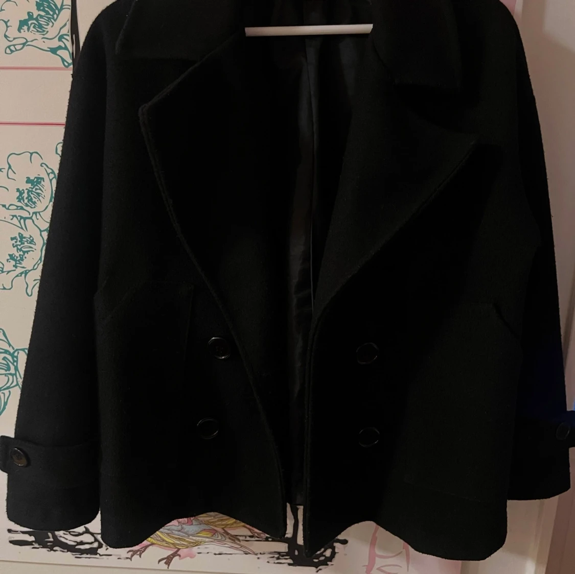 Stilren svart kappa med dubbelknäppning och bred krage från Design by Si. Lite nopprig därav priset! Strl xs/s