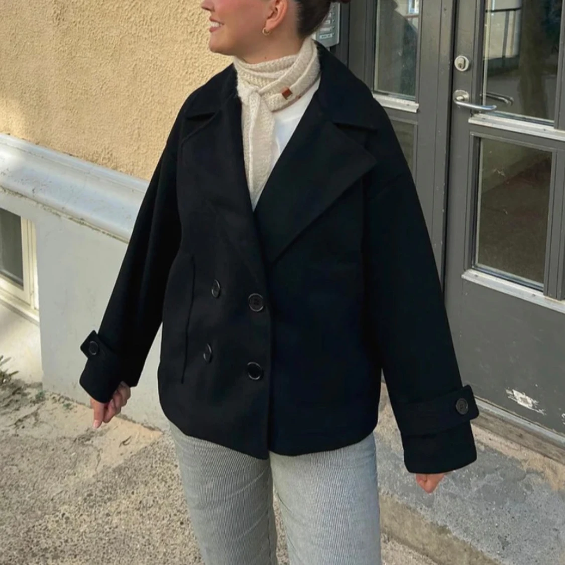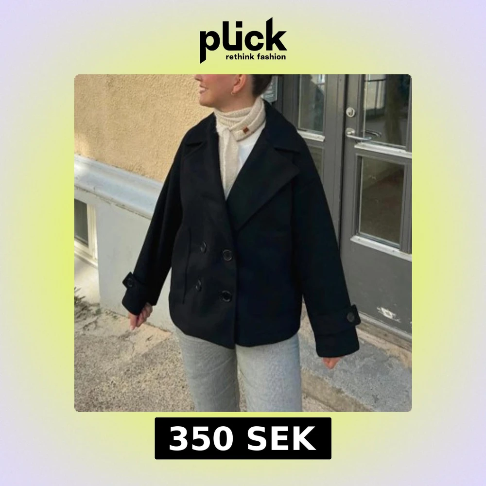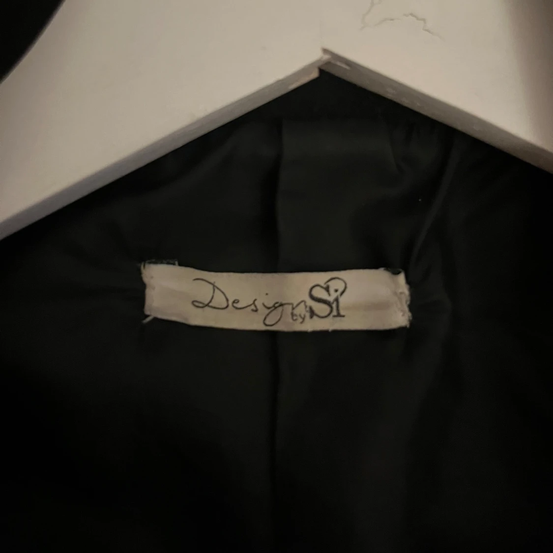 Stilren svart kappa med dubbelknäppning och bred krage från Design by Si. Lite nopprig därav priset! Strl xs/s