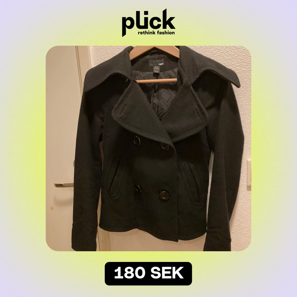 Säljer en stilren svart kappa från H&M i mycket bra skick. Den har en klassisk dubbelknäppning med stora knappar och en snygg krage. Perfekt för höst och vår! Passar både till vardags och fest. 🖤