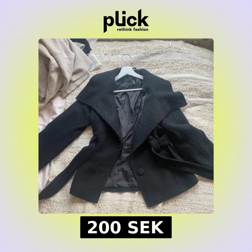 Snygg svart kappa från H&M med bred krage och knytbälte i midjan. Perfekt för kyligare dagar med sin stilrena design och bekväma passform.