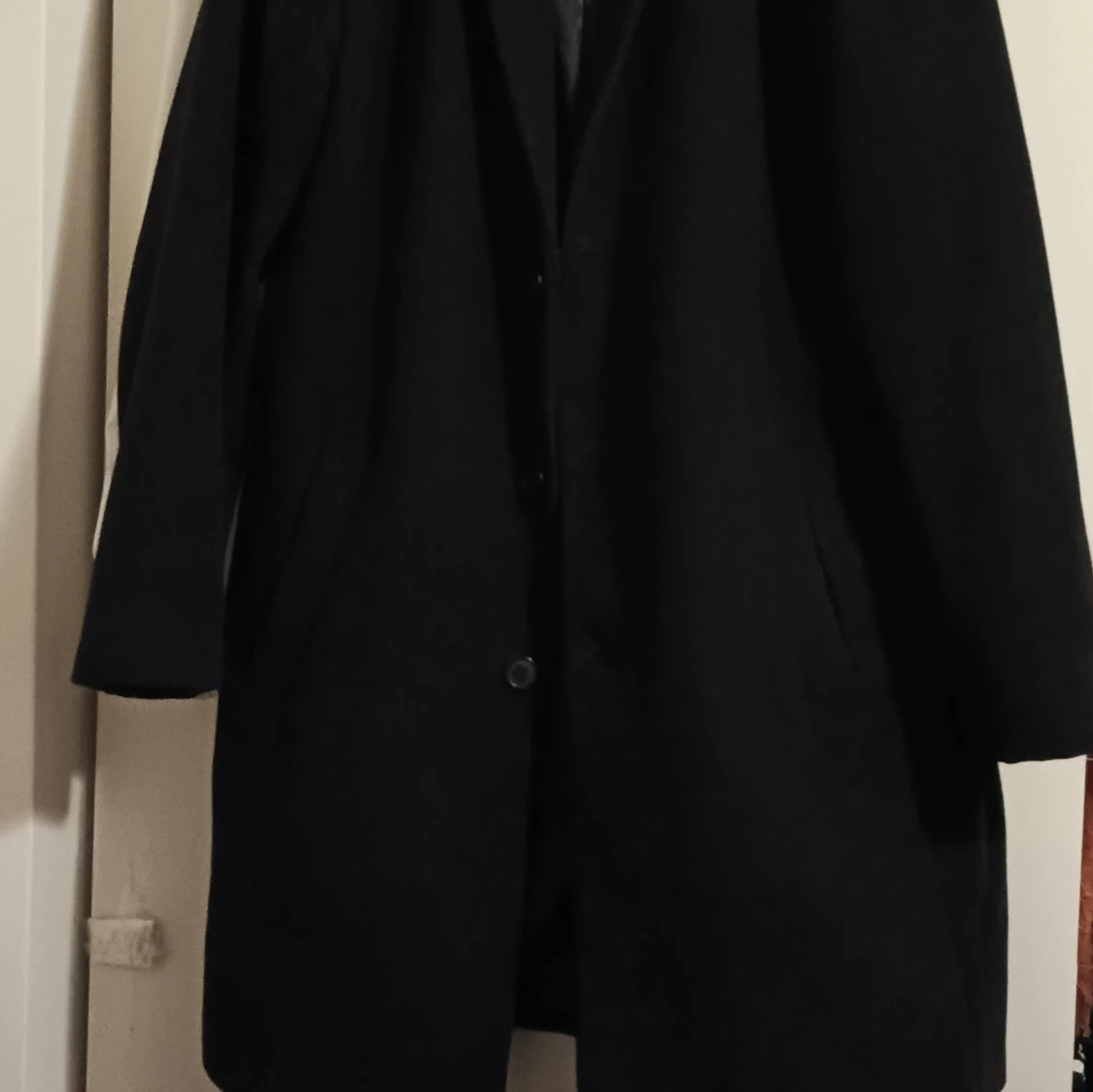 Manlig, svart kappa från KIOMI i storlek L. Har nyligen köpt en ny kappa och därför bestämt mig för att göra mig av med denna. Varsamt använd och är i gott skick! Material: Ullblandning