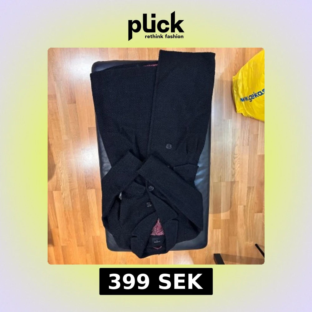 Säljer en svart kappa från Lindex i storlek 36. Jackan har ett snyggt bälte i midjan, knappar framtill och ett mönstrat rött innerfoder. Materialet är grovstickat och ger en cool struktur. Perfekt för dig som gillar klassisk stil med en twist.