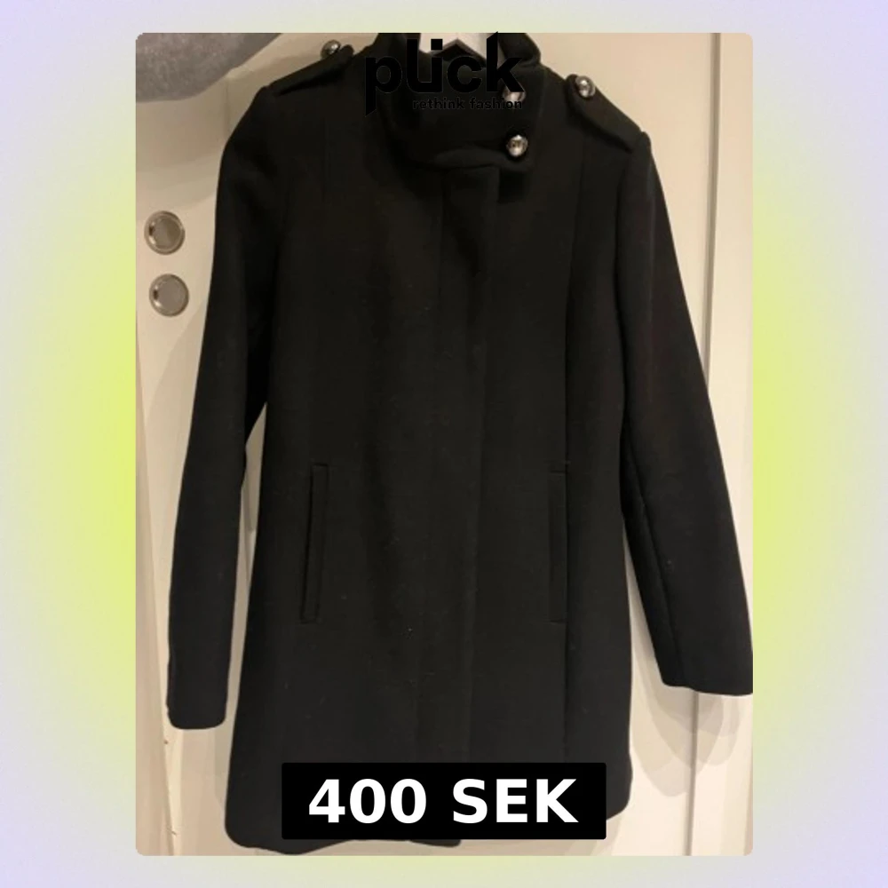 Säljer en svart kappa från Lindex i storlek S. Jackan har knappar vid axlarna och halsen, samt dold dragkedja. Rak passform, klassisk krage och två fickor framtill. Perfekt för dig som gillar stilrena och tidlösa plagg. Endast använd ett fåtal gånger, fint skick!