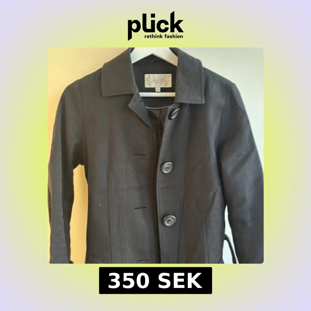 Snygg svart kappa från Riley i storlek XS. Jackan har en klassisk krage och knäpps med stora knappar framtill. Den har ett bälte i midjan för en figursydd look och långa ärmar med uppvikta muddar. Perfekt för en stilren och elegant outfit.