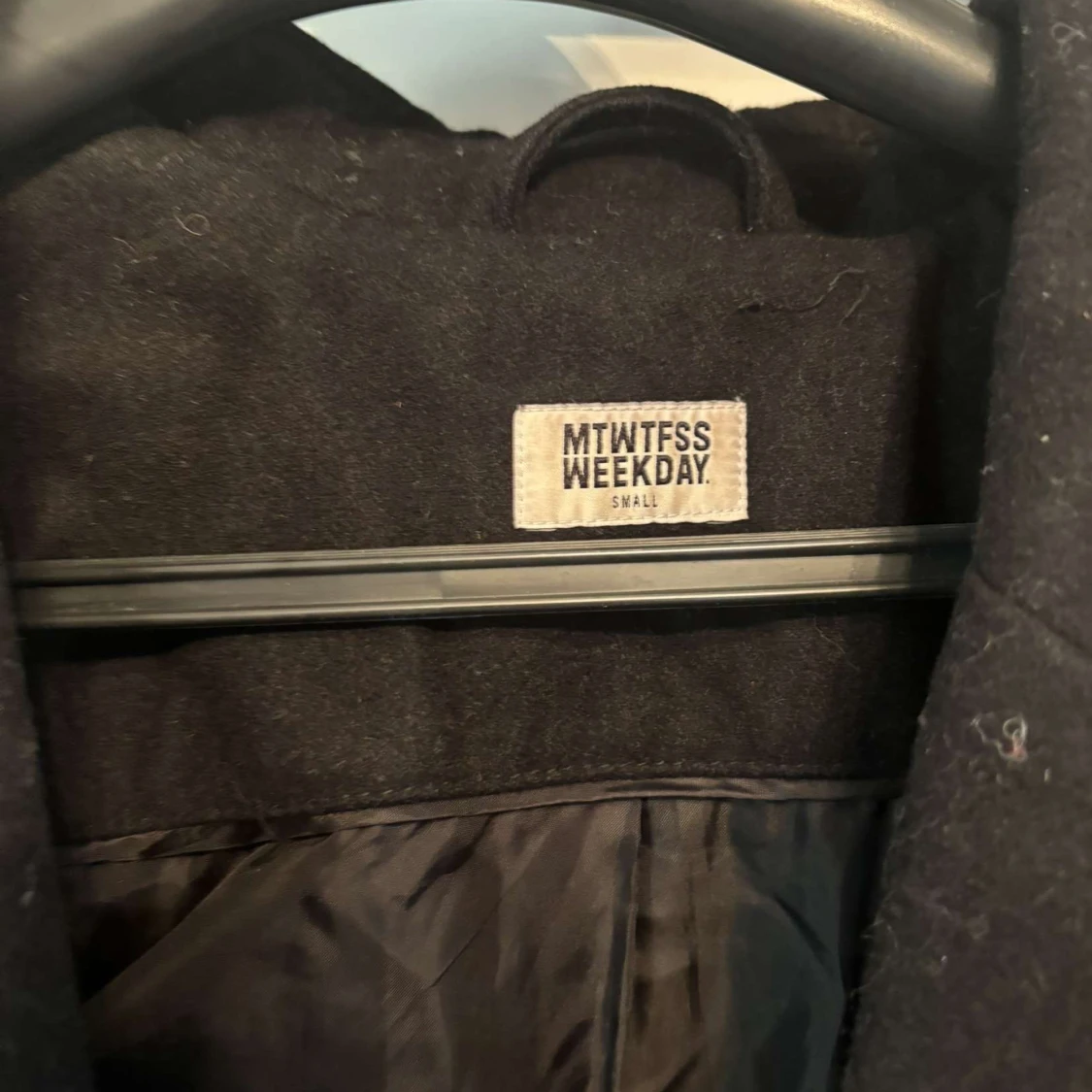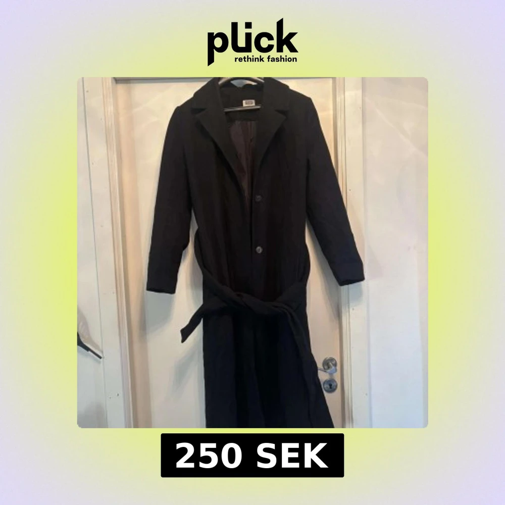 Snygg svart kappa från Weekday i storlek S. Klassisk rak modell med krage, knappar framtill och ett matchande bälte i midjan. Långärmad och fodrad för extra komfort. Perfekt för dig som gillar stilrena och minimalistiska plagg.