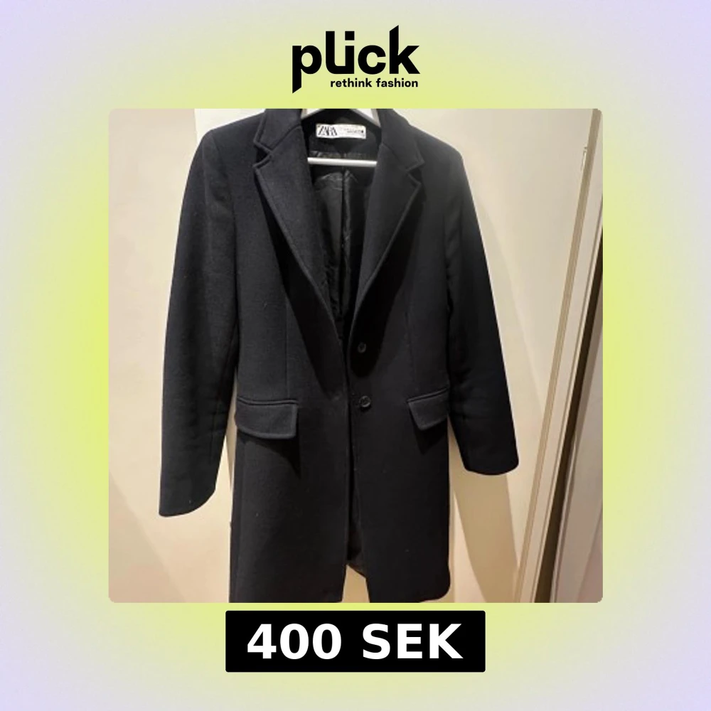 Stilren svart kappa från Zara med klassisk krage och snygga fickdetaljer. Tillverkad i ull från Manteco, med knappar framtill och på ärmslutet. Lite nopprig men går lätt att få bort! I bra kvalité. Nypris 1799. Jag upplever storleken som liten