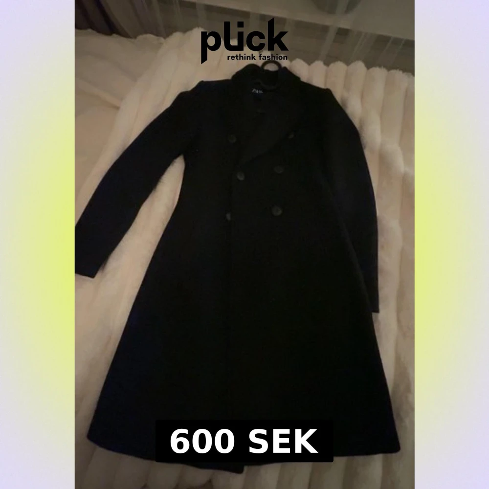 Stilren svart kappa från Zara i klassisk modell med dubbelknäppning och lång ärm. Snygg och tidlös design. Säljs pågrund av att den är för liten. Fråga om bilder så kan jag skicka.