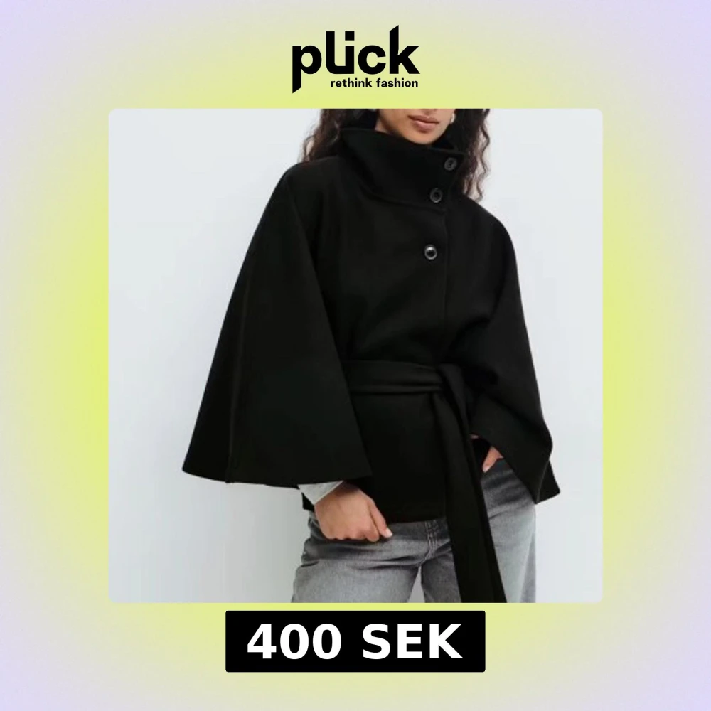 Svart kappa med cool hög krage och knappar framtill. Jackan har vida ärmar och ett matchande bälte i midjan för snygg siluett. Perfekt för dig som gillar minimalistisk stil och vill ha något som sticker ut. Materialet känns mjukt och har en lyxig känsla. Pris kan diskuteras har knappt haft på mig den
