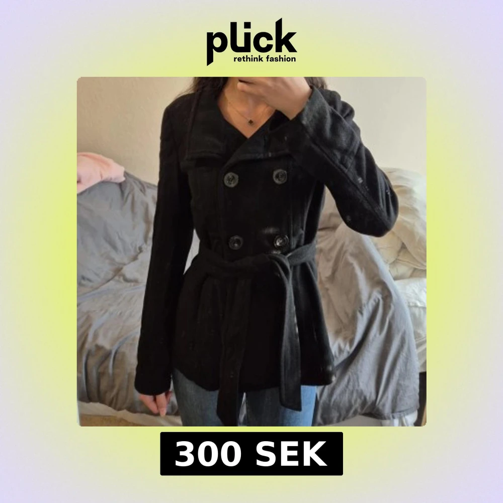Stilren svart kappa med dubbelknäppning och bälte i midjan. Jackan har långa ärmar, klassisk krage och stora knappar framtill. Perfekt för dig som gillar en tidlös look med lite edge. Materialet känns mjukt och värmande, passar bra till jeans eller klänning. Passar mig som har xs/s i jackor också.