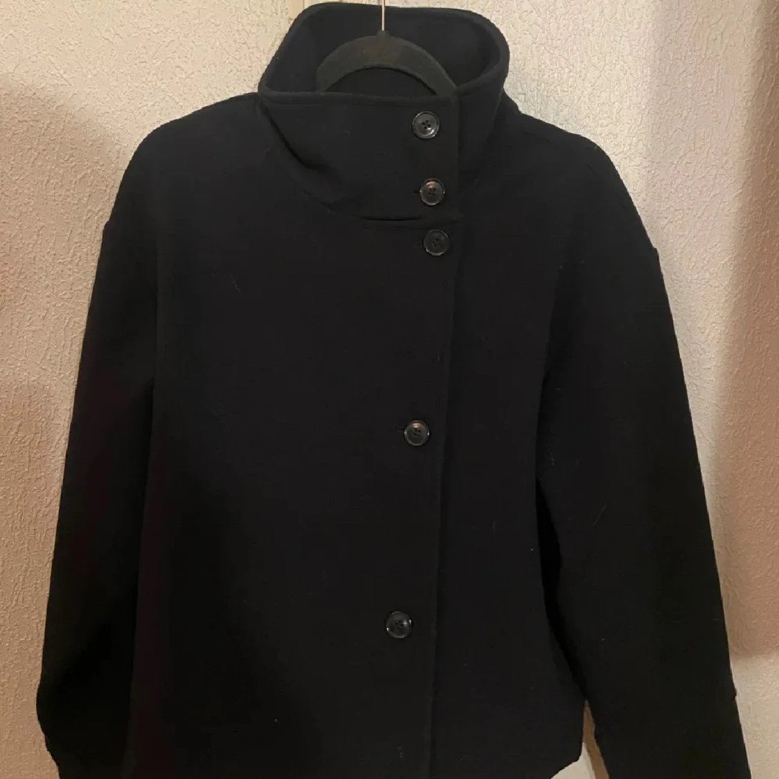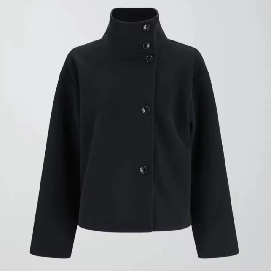 Elegant svart kappa med hög krage och knappar framtill. Perfekt för kyligare dagar med sin stilrena design och långa ärmar.
