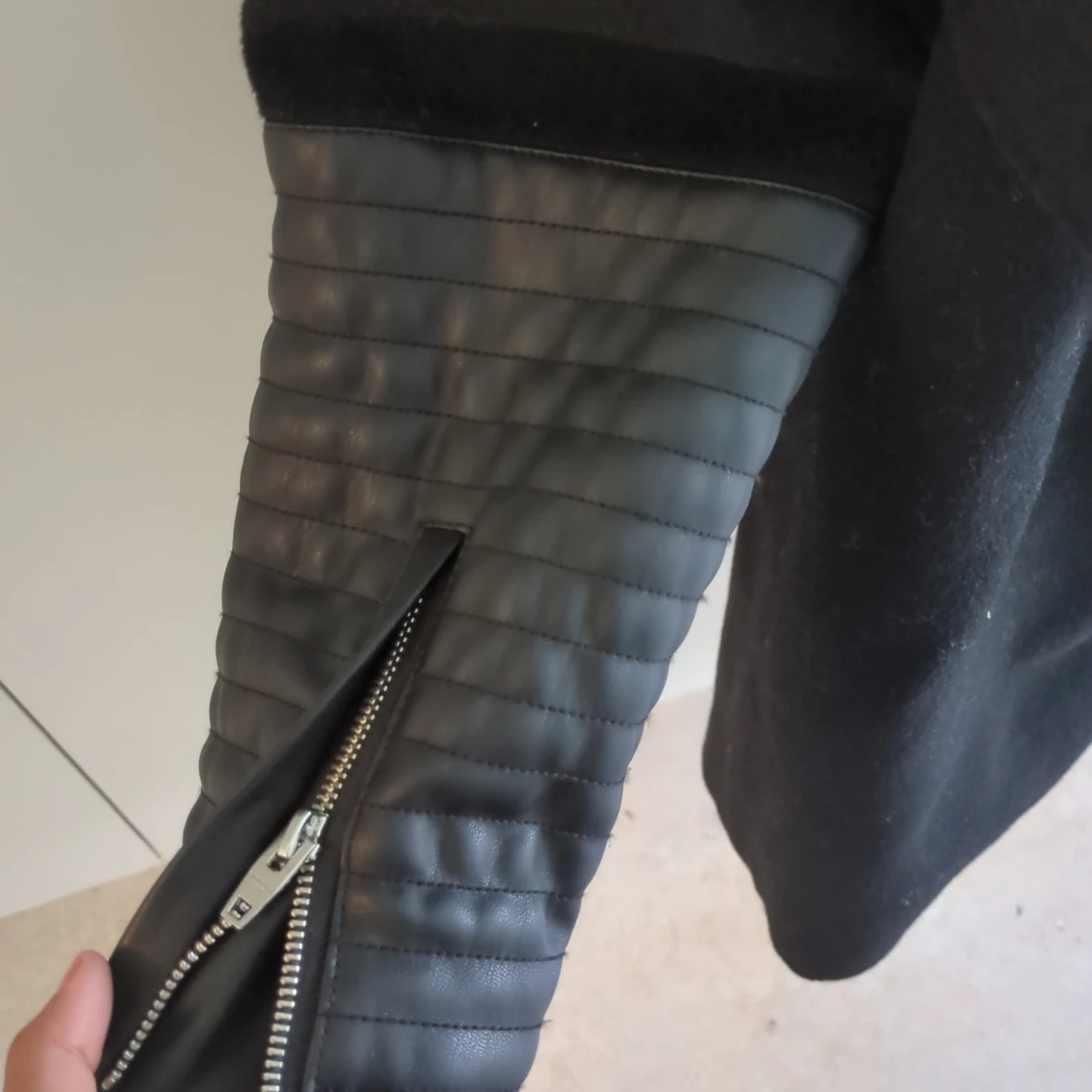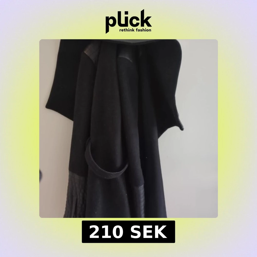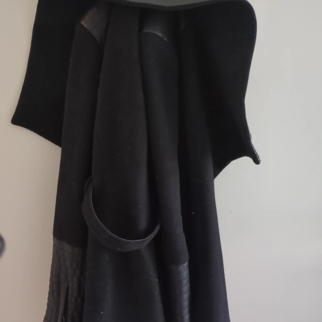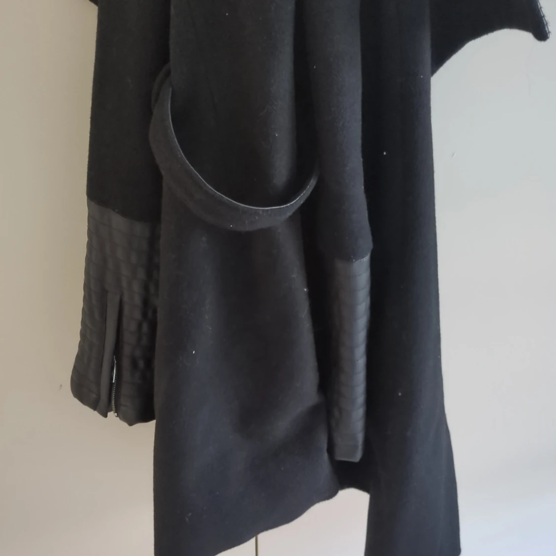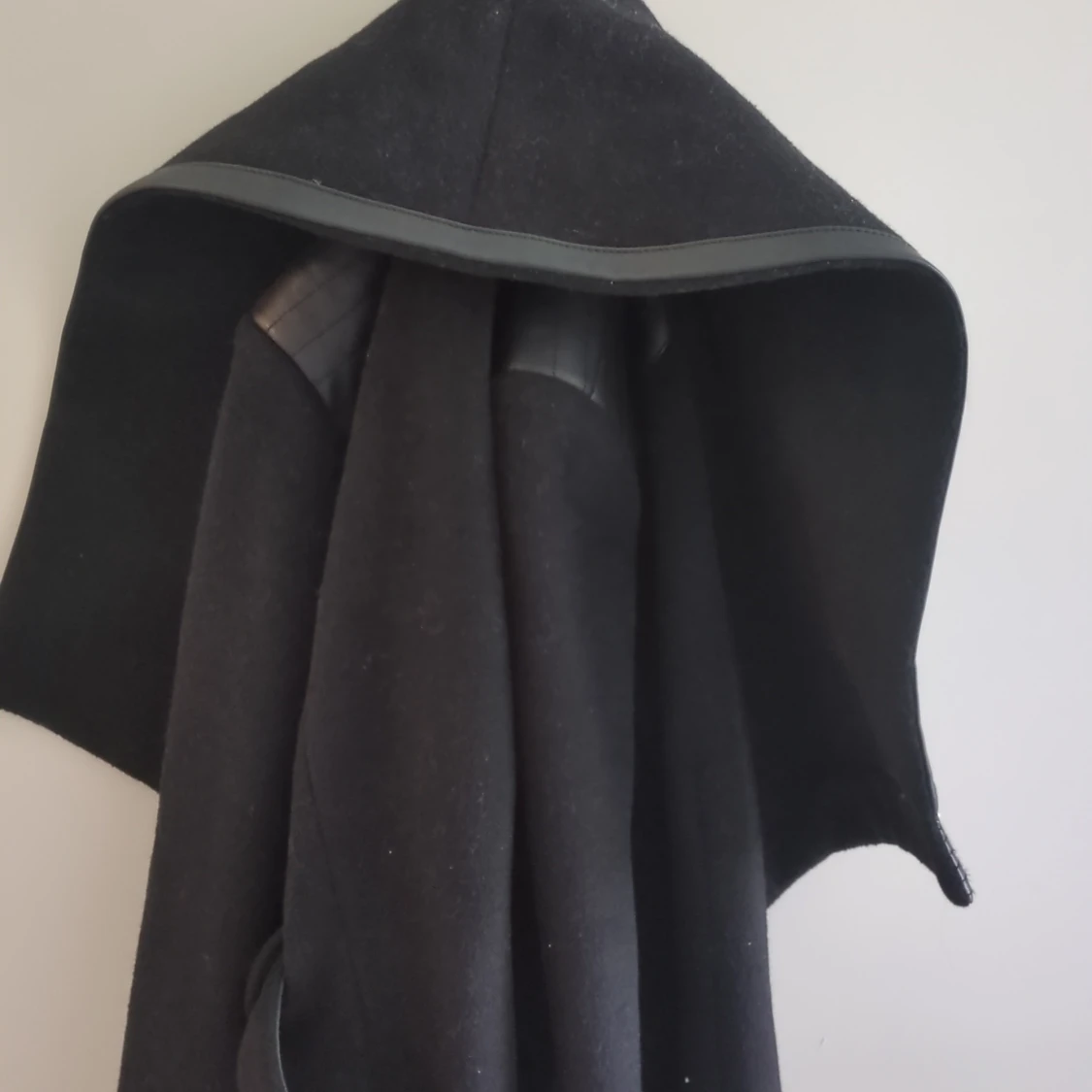 Snygg svart kappa med stor huva och coola detaljer i skinn på ärmarna. Jackan har bälte i midjan och dragkedjor vid ärmsluten för extra edge. Perfekt för dig som gillar en stilren men ändå unik look.