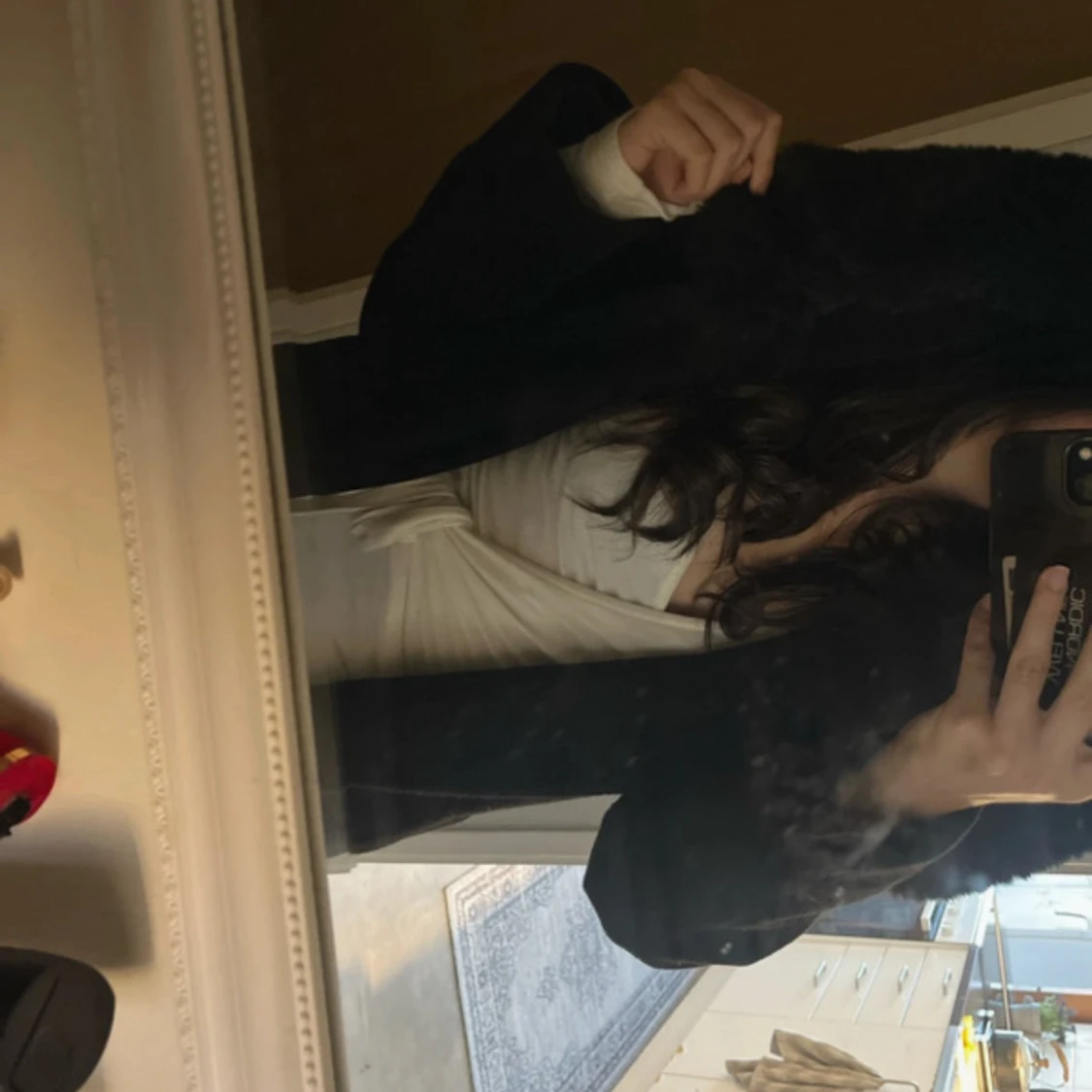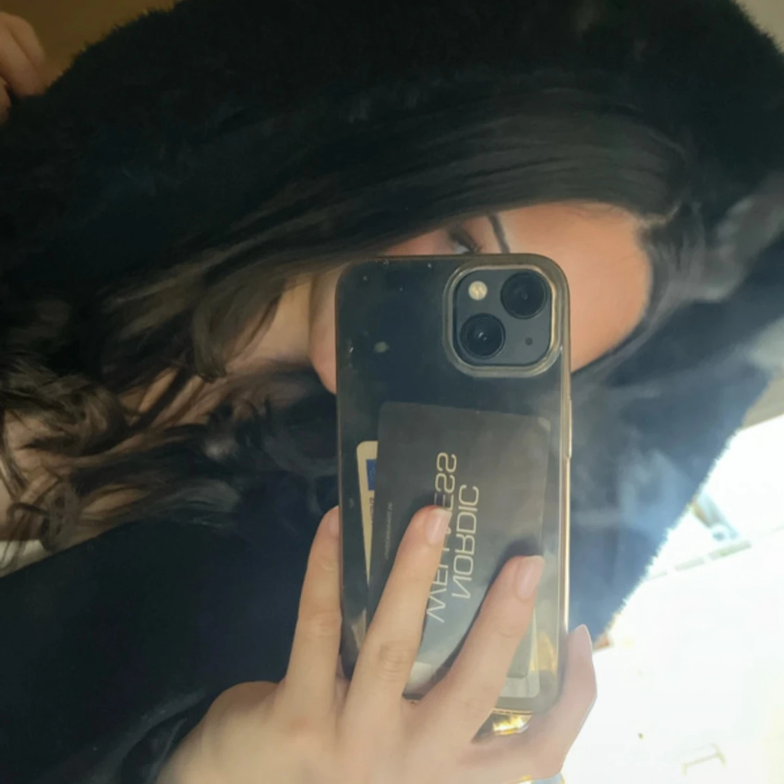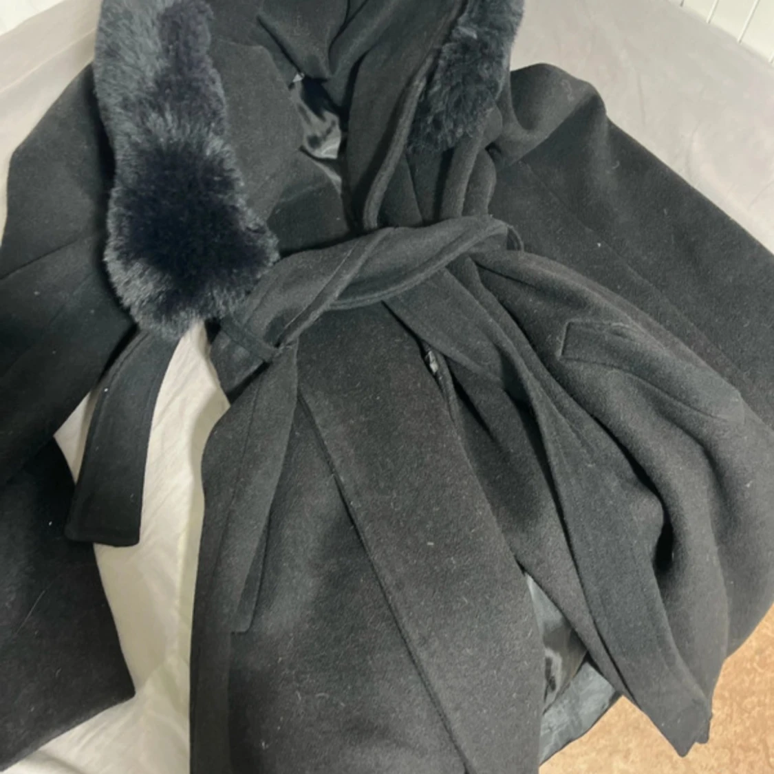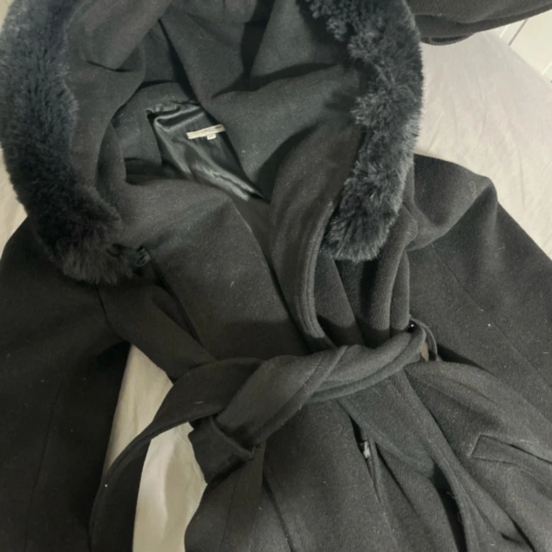 Säljer en svart kappa med stor huva och fuskpäls runt kanten. Jackan har ett bälte i midjan för snygg passform och är helsvart med klassisk look. Perfekt för kalla dagar när du vill vara både varm och stilren.