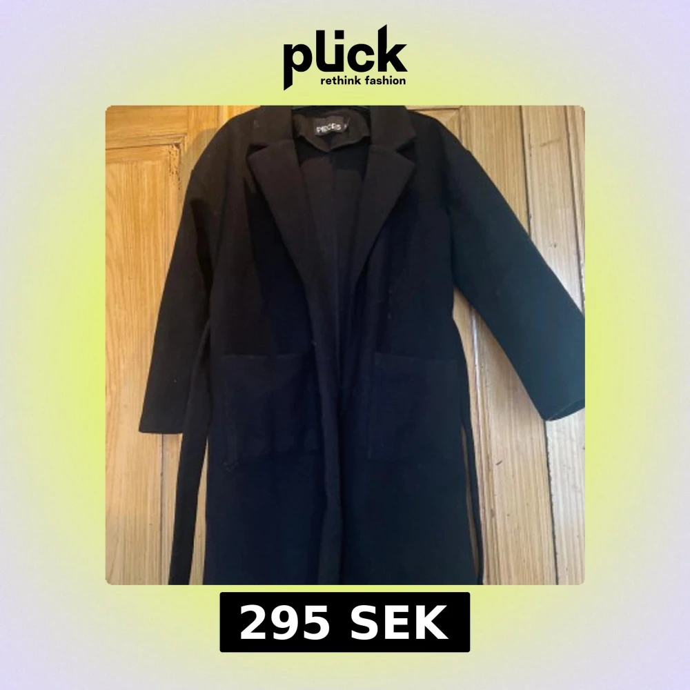 Svart lång kappa från Pieces med klassisk krage och två stora fickor framtill. Jackan har ett snyggt bälte i midjan för att kunna knyta och justera passformen. Perfekt för dig som gillar stilrena och enkla plagg med lite edge. Lite för liten på mig nu. Inga defekter! Behöver bara håras av med en roller. Obs den är inte fodrad inuti!