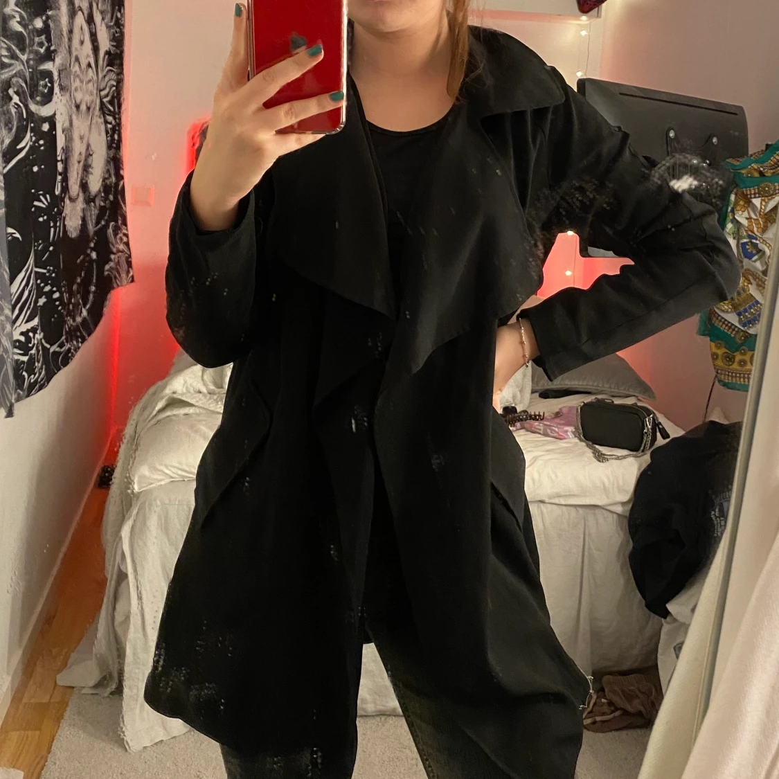 En skitsnygg svart kappa/trenchcoat!! Har kommit mycket till användning men är fortfarande i bra skick. Passar verkligen till allt!!! Den går ner till lite över knäna på mig ungefär och jag är 159 cm lång. Kommer med ett band i samma tyg man kan sätta i öglorna i midjan och dra åt! Hör av er om ni har frågor!💕💕💕💕