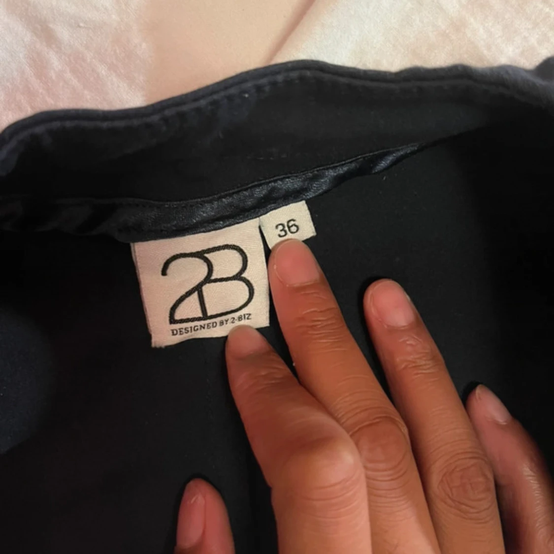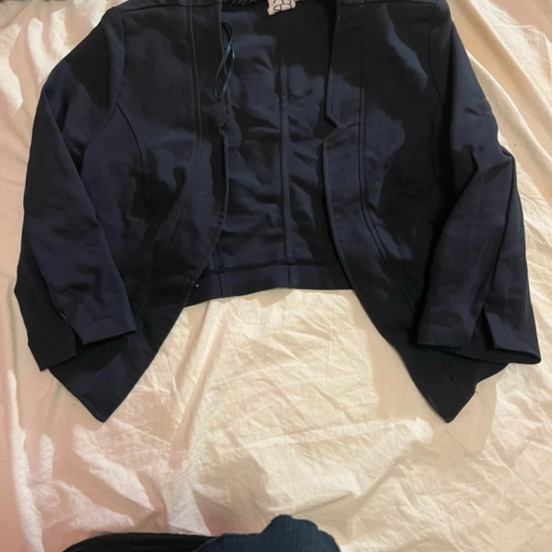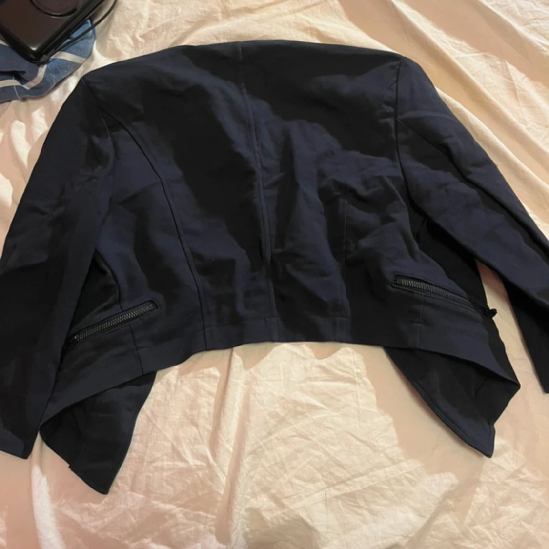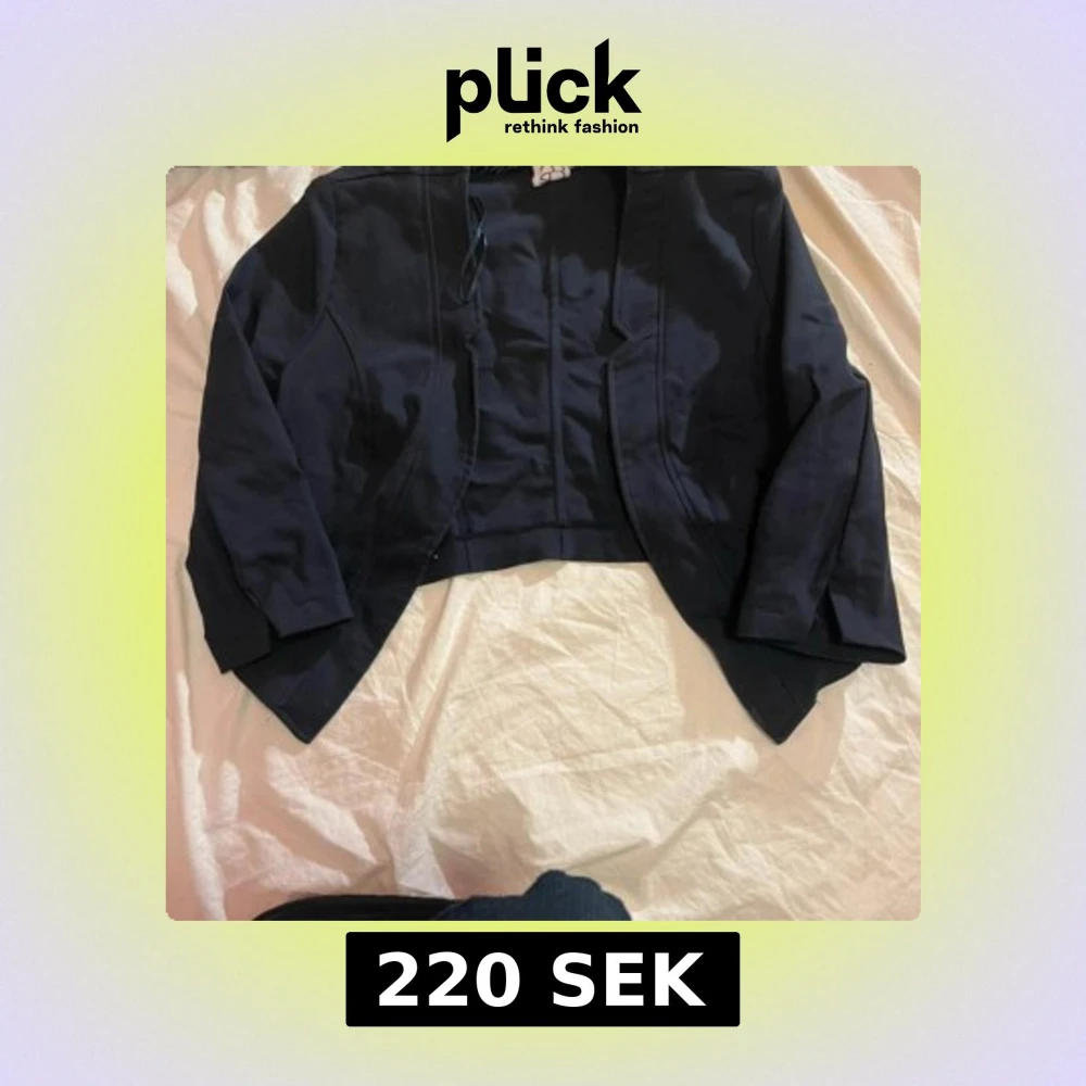 Snygg svart kavaj från 2-Biz i storlek 36. Modellen är croppad med spetsiga kanter framtill och har långa ärmar.