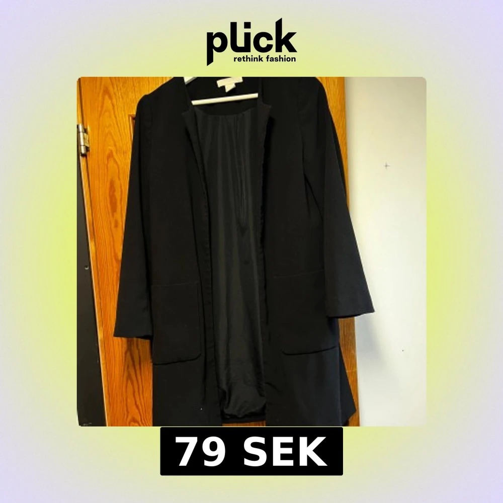 Svart kavaj men mer en tunn kappa från H&M i storlek 38. Klassisk rak modell med långa ärmar och två stora fickor framtill. Tunn fodring på insidan och enkel, stilren design utan knappar. Perfekt för en clean och snygg look.