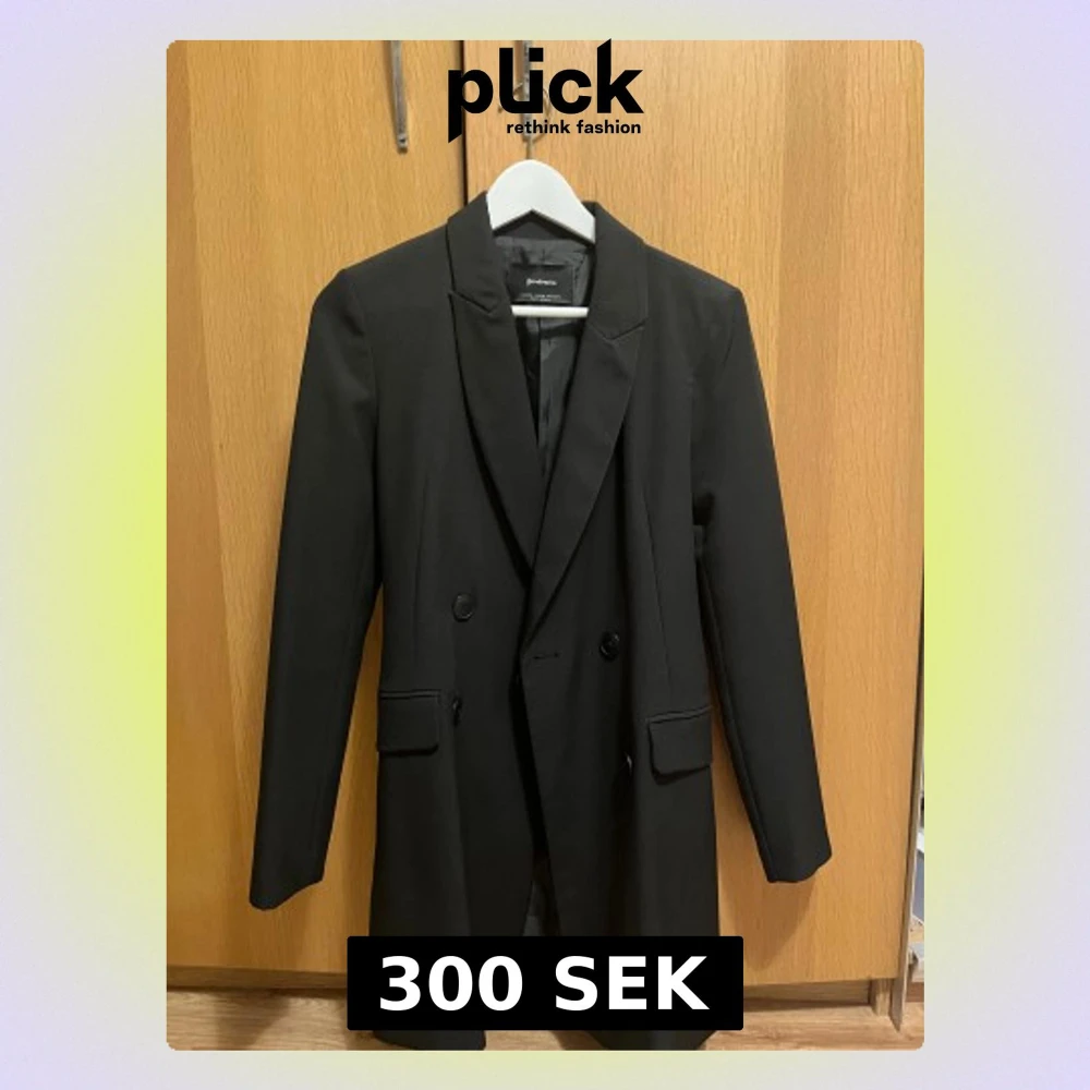 Snygg svart kavaj från Stradivarius i storlek XS. Dubbelknäppt modell med klassisk krage, långa ärmar och fickdetaljer framtill. Tillverkad i ett slätt tyg med fodrad insida, perfekt för en stilren look.