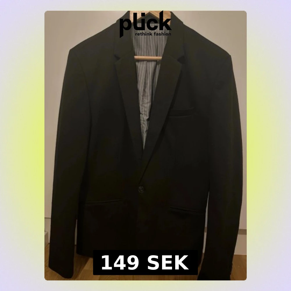 Stilren svart kavaj från Zara Collection i storlek L. Klassisk design med smal passform, ett knappstängning framtill och två fickor. Insidan har ett grått, randigt foder som ger en snygg kontrast. Perfekt för dig som vill ha en clean look.