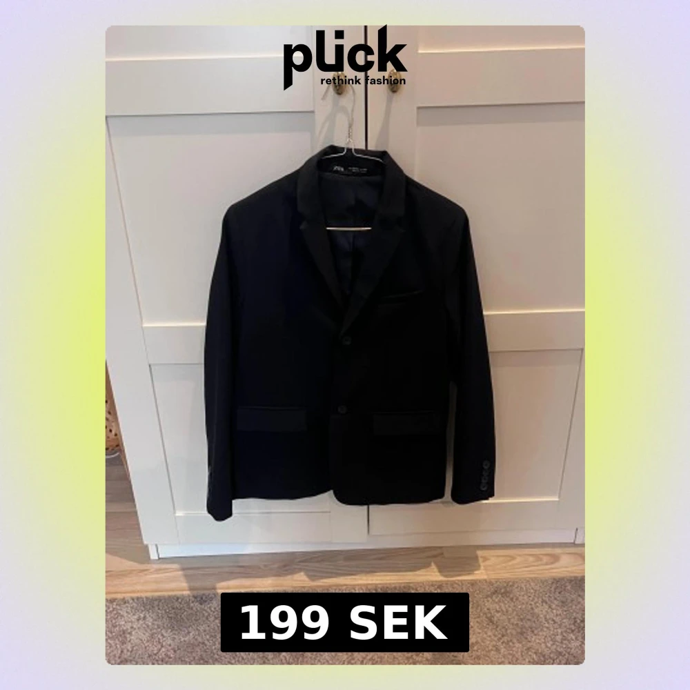 Stilren svart kavaj från Zara med klassisk krage och två knappar framtill. Kavajen har två fickor med lock och en bröstficka, samt knappar vid ärmsluten. Perfekt för en dressad look och passar till många olika outfits.
