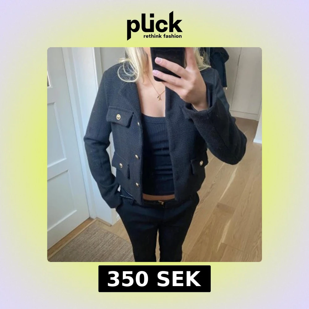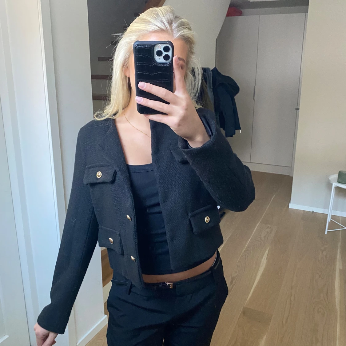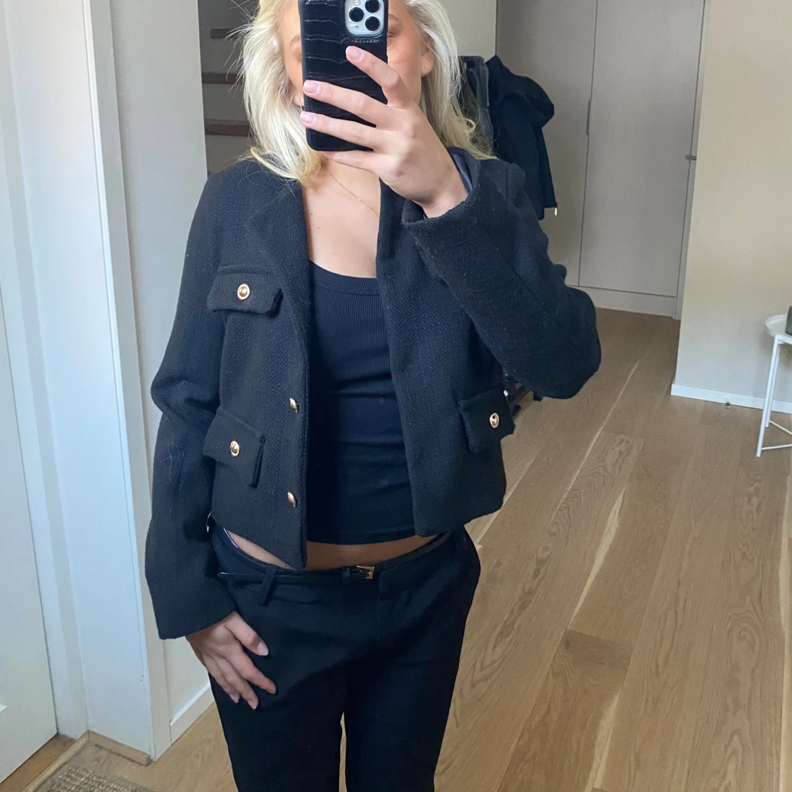 Säljer en svart kavajjacka med snygga guldknappar och fyra fickor framtill. Jackan är croppad och har en klassisk, rak passform. Materialet är strukturerat och känns lite tjockare, perfekt för lager-på-lager. Enkel att styla till olika looks. Använd endast en gång, därav väldigt bra skick!! 😍😍