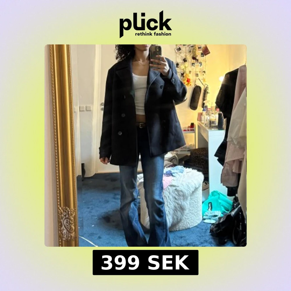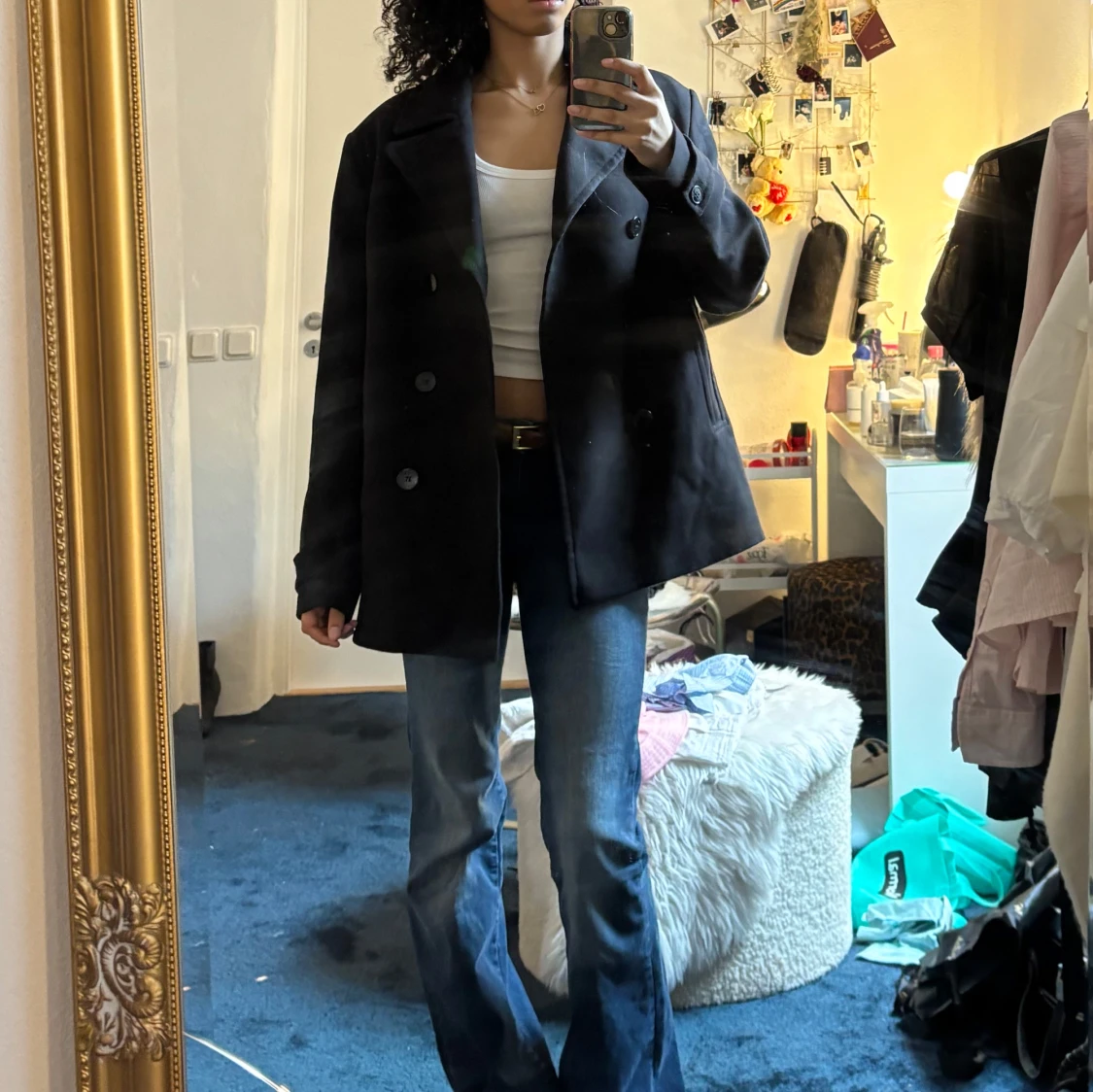 Säljer en svart kavajjacka från H&M med dubbelknäppning och klassisk krage. Jackan har en rak och något oversized passform, långa ärmar och är tillverkad i ett slätt tyg med fodrad insida. Perfekt för en stilren look.