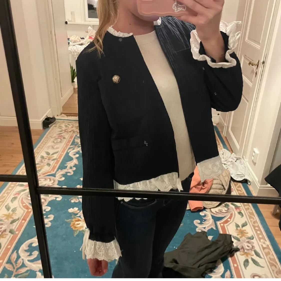 Snygg svart kavaj med unika spetsdetaljer vid ärmslut och nederkant. Gör alla outfits snyggare och super skick!💞