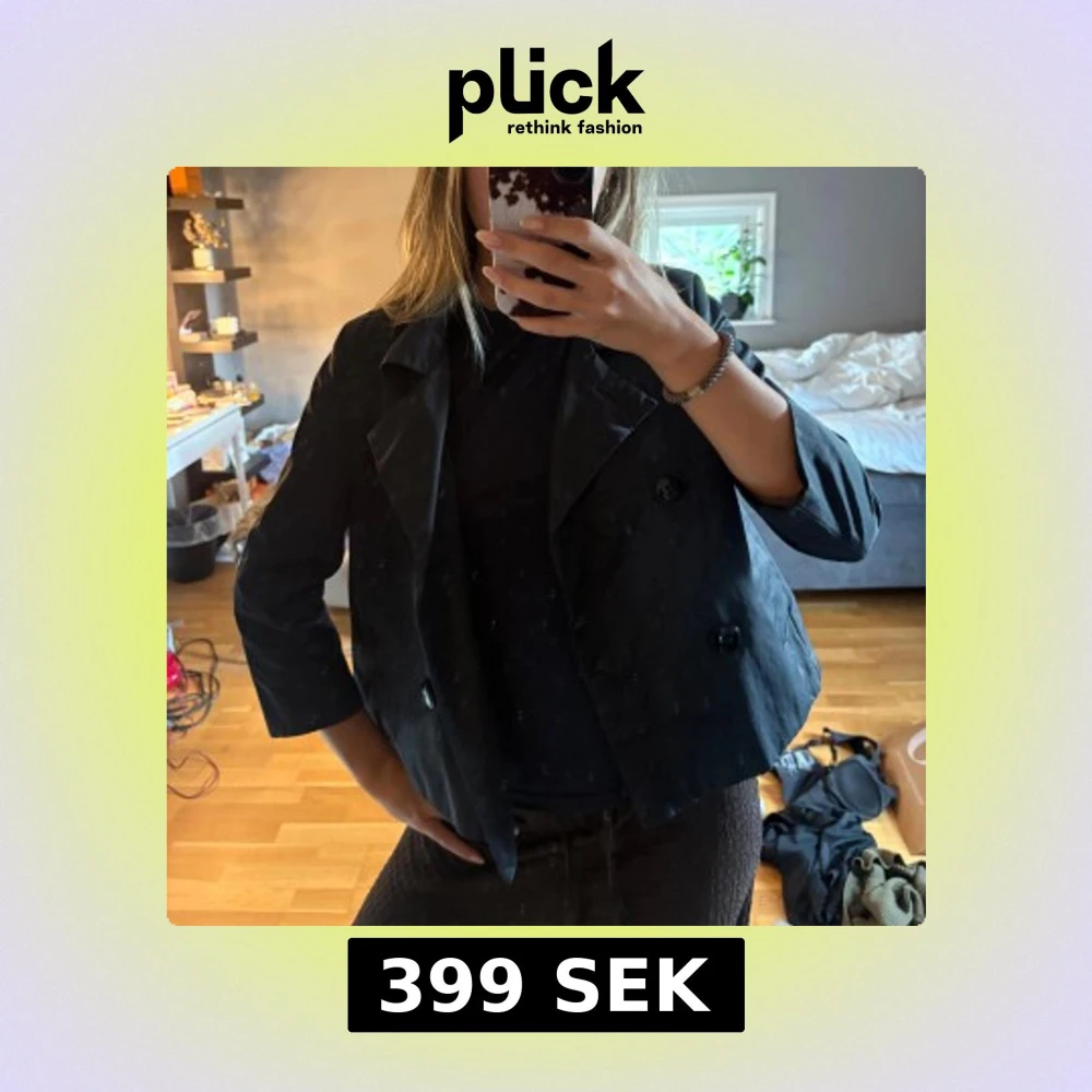 Snygg svart kavaj från H&M med dubbelknäppning och klassisk krage. Modellen är croppad och har tre kvarts armar. Perfekt för dig som vill ha en stilren och trendig look. Materialet är lätt och känns bekvämt på.