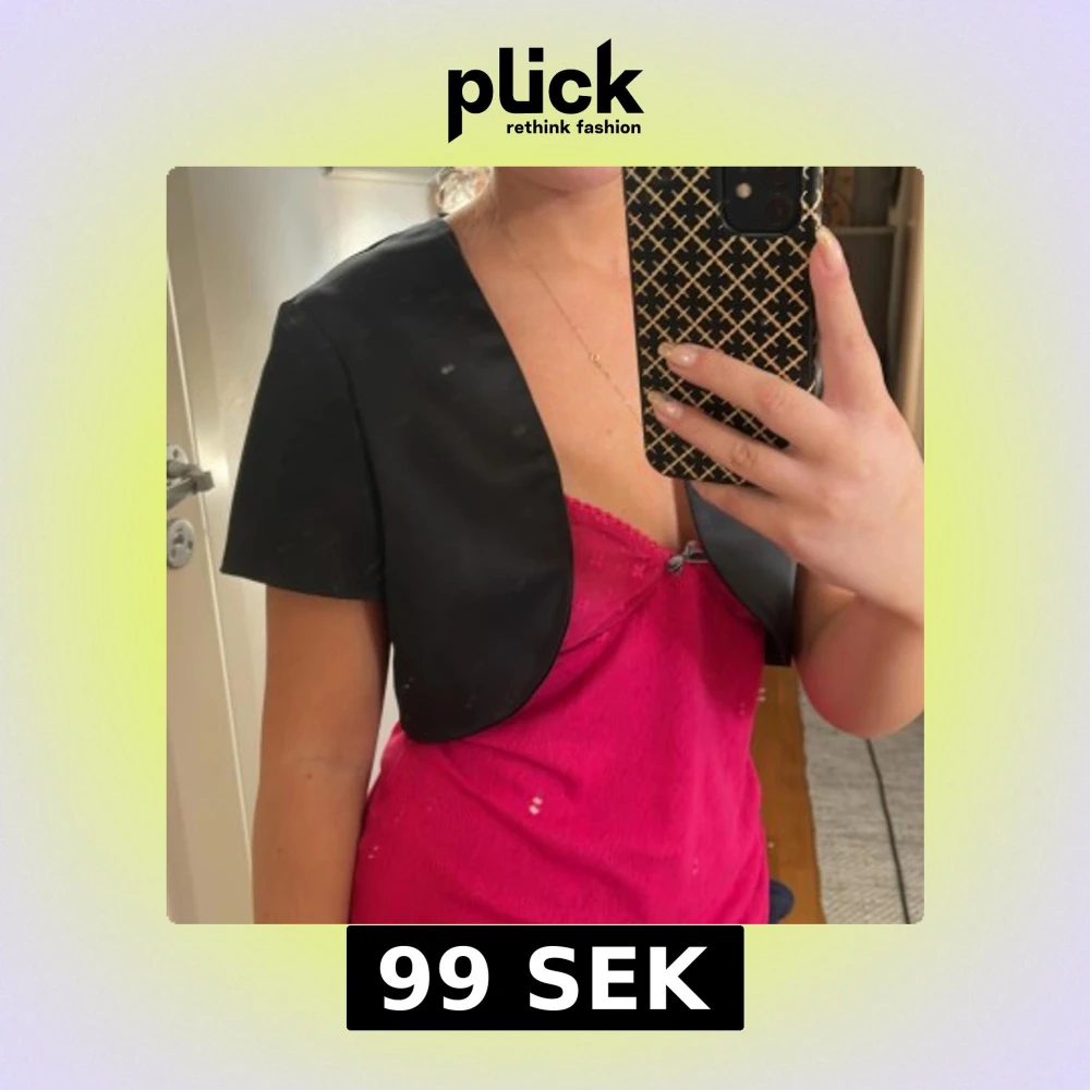 Snygg svart kort väst i satin med enkel, stilren design och korta ärmar. Perfekt att slänga över en klänning eller topp för en extra touch. Västen har en öppen front och en elegant, minimalistisk look.