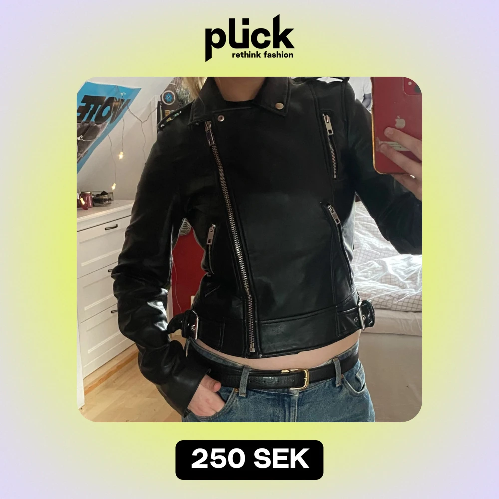 En svart tight läderjacka (inte äkta läder) från Zara! Använd några gånger men har inga skador. Perfekt til hösten och är i storlek S men passar också som XS!