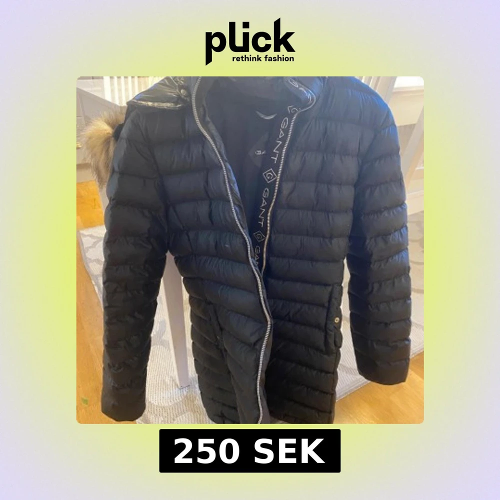 Säljer en svart, lång dunjacka från GANT med snyggt quiltad design och huva med fuskpäls. Jackan har dragkedja framtill, tryckknappar vid fickorna och GANT-logga på bröstet. Perfekt för kalla dagar och riktigt stilren look.