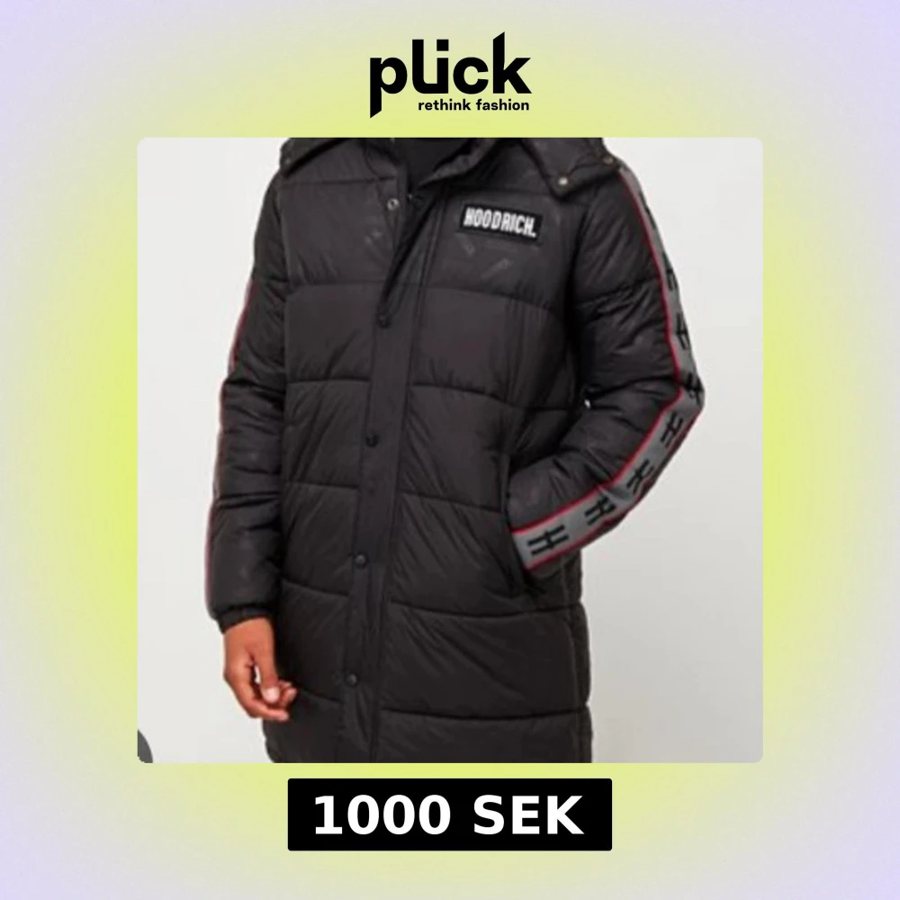 Lång svart dunjacka från Hoodrich med huva och logga på bröstet. Jackan har quiltad design, knappar och dragkedja framtill samt gråa detaljer med svarta symboler och röd kant längs ärmarna. Perfekt för kalla dagar och riktigt snygg streetstil.