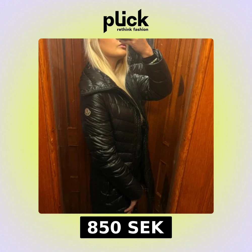 Säljer en svart, lång dunjacka från Moncler med quiltad design och hög krage. Jackan har dragkedja framtill, två sidofickor och Moncler-logga på ärmen. Perfekt för kalla dagar och har en snygg, slim passform som ger en clean look.