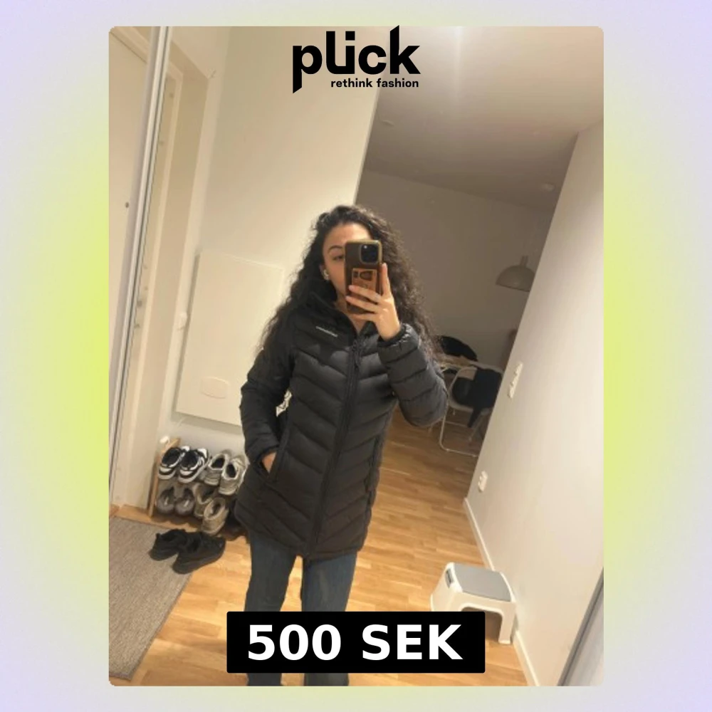 Säljer en svart, lång dunjacka från Peak Performance med huva och dragkedja framtill.