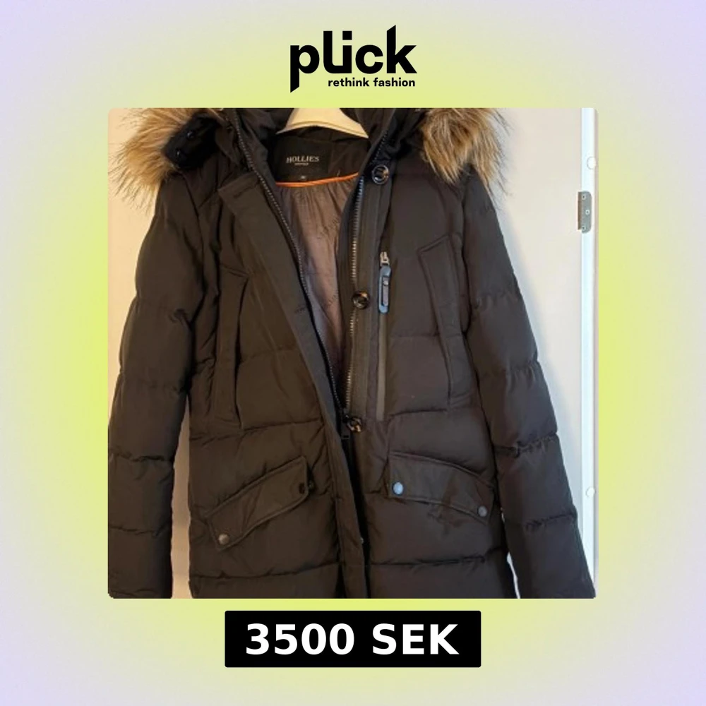 Säljer en svart ÄKTA dunjacka från Hollies med fluffig fuskpäls på huvan. Jackan har långa ärmar, flera fickor med knappar och dragkedja framtill. Den är quiltad och har en snygg, klassisk look som passar perfekt när det är kallt ute.